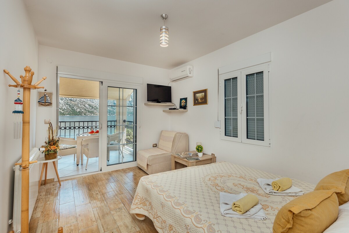 Tastefully decorated Green Studio apartment with sea view from balcony. Fully-equipped with A/C, LCD TV, WIFI, BBQ, hairdryer, beach towels..providing you with comfort and everything you may need for relaxing & enjoyable vacation in Montenegro. Deluxe Green Studio apartment located first line from the sea has a large sunroof terrace of 140m2, offering a magnificent view of the bay of Tivat. Beach is located a short walking distance from Green Apartments, just on another side of street!