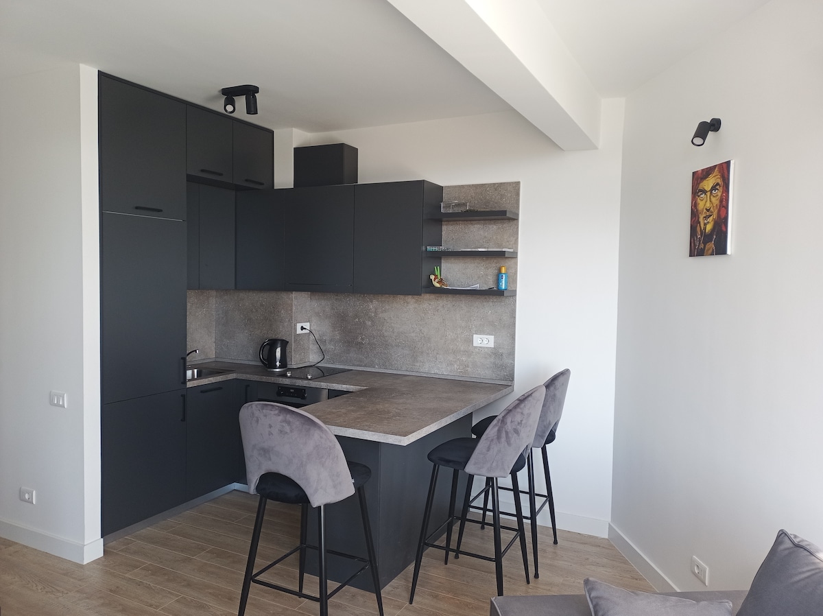 Appartement non fumeur avec une chambre, une cuisine ouverte sur pièce de vie principale, espace bureau, vue sur la mer adriatique et sur les montagnes. Salle de bain avec lave-linge. Résidence de haut standing sécurisée avec système de vidéo surveillance, parking sous-terrain, piscine, réception, terrasses pour les résidents. Internet haut débit, écran TV (sans accès aux chaînes de télévision) 2 minutes du centre-ville et de la plage en voiture (et à 13 minutes à pied)