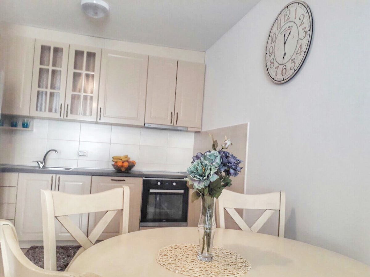 Brand new, cozy one bedroom apartment is located in area Kalimanj, in Tivat. It is modernly furnished with fully equipped kitchen, air conditioner, very good WIFI and cable TV, parking in front of the building. It is 450 meters away from the beach, 10 minutes walk from centre of the town and 15 minutes walk from Porto Montenegro. It is great for couples and families.