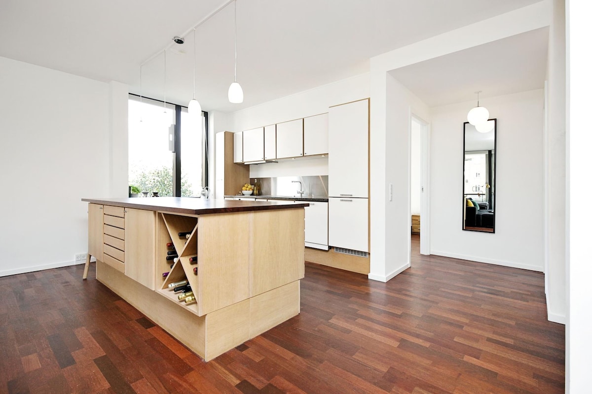 4 room 92 m2 apartment w/ 3 bedrooms w/ south facing balcony situated in harbor in the charming canal district. The magnificent views of both the canals and the harbor distinguishes it from other apartments. - 3 double beds in 3 seperate rooms - Subway 25 min to airport / 6 min to center - Suited for families/groups max. 6 persons. - Taxi to airport: One way is 30€ / 15 min - Parking 350m away - E-car: Charging is not an option - Notice: This is my private home with soul and personal stuff
