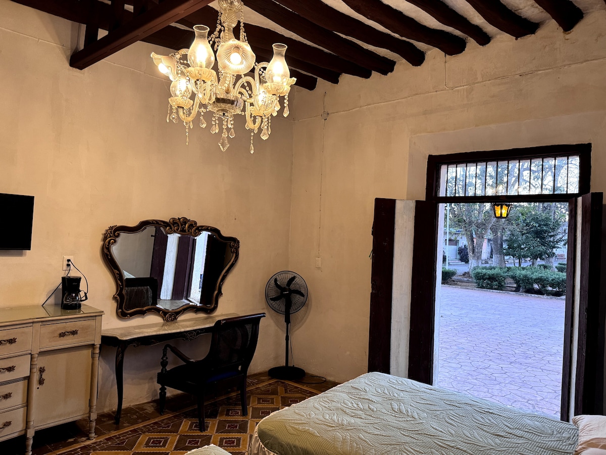 Habitación con 2 camas matrimoniales, decoración estilo vintage colonial , ubicado en el parque y con vista panorámica del centro del pueblo, jardín y terraza posterior con vista a patio arbolado, a un costado de la Iglesia de San Esteban construida en el año de 1542 y con unos de los retablos mas bonitos del estado de Yucatán, estacionamiento a puerta de habitación gratuito, junto al restaurante La Casa del Coronel y a 2 min del Cafe Estación 1888, a 15 Min de La zona Arqueológica de Ekbalam.