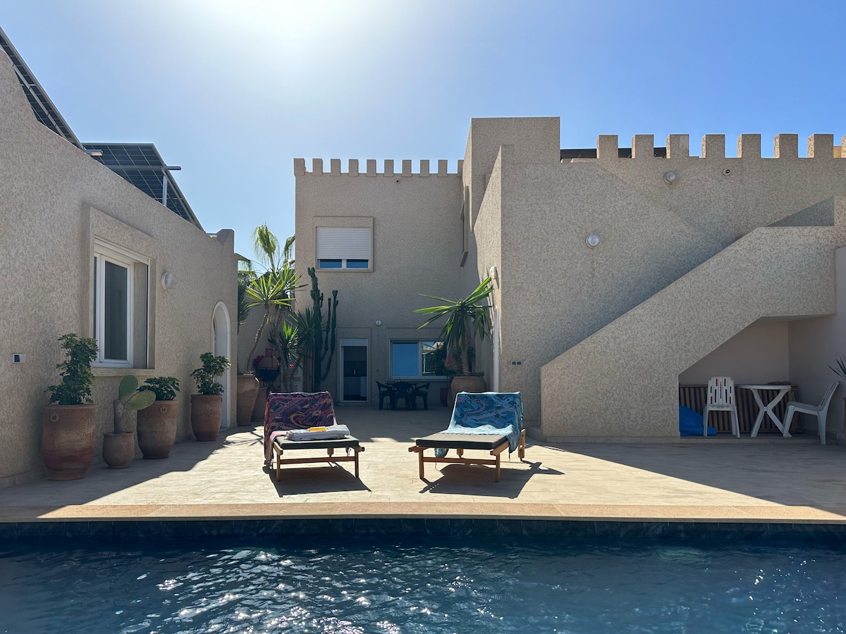 Maison familiale de 400 m2 entièrement rénovée dans le style sud marocain (sanitaires et cuisine refait à neuf), avec jardin de 400 m2 dans l'oasis de Zaouit Aglou, à 2 km de la mer et à 10 km au nord ouest de Tiznit, à une heure au sud de l’aéroport international d’Agadir, Maroc. Internet; Epiceries, pharmacie, poste de santé dans le village.Tous commerces à Tiznit. A proximité de très belles plages sauvages Résa instantanée supprimée car problème initialement. Tout est rentré dans l'ordre!