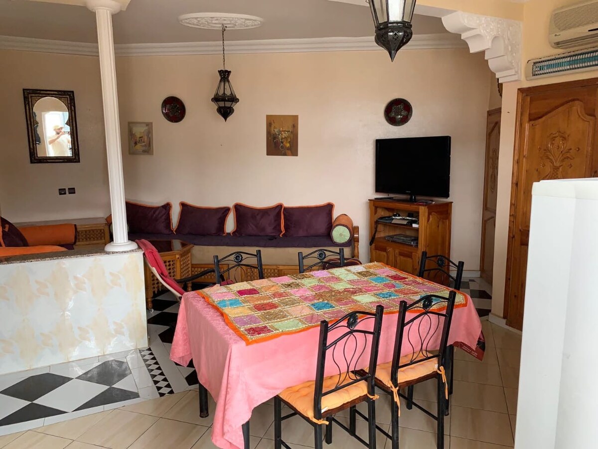 Dans le domaine cap daglou en bord de mer a 100 KM sud AGADIR.Appartement securise de 200 m2 spacieux, tres bien équipé, deco boheme. Logement pour 6 personnes maxi, avec 3 belles grandes chambres à coucher dont une suite parentale avec linge et serviettes, 2 SDB, cuisine équipée, WIFI fibre, Télévisions, salon/séjour de 57 m2, terrasse de 44m²,accès à la plage à pied par la résidence. 2 piscines.Terrain de pétanque.Vue mer et montagne. Plage confidentielle. Peche, ballade,quad,equitation...