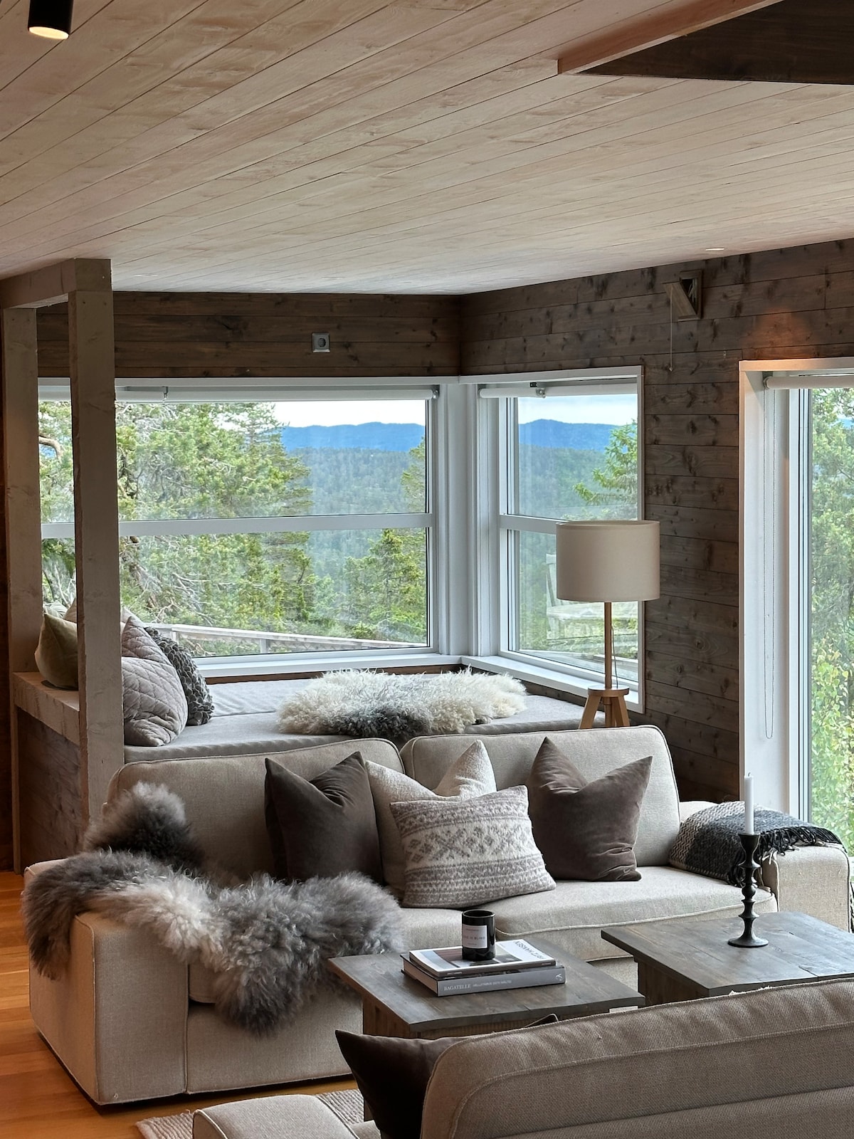 Arkitekttegnet designerhytte med utsikt til sjøen.