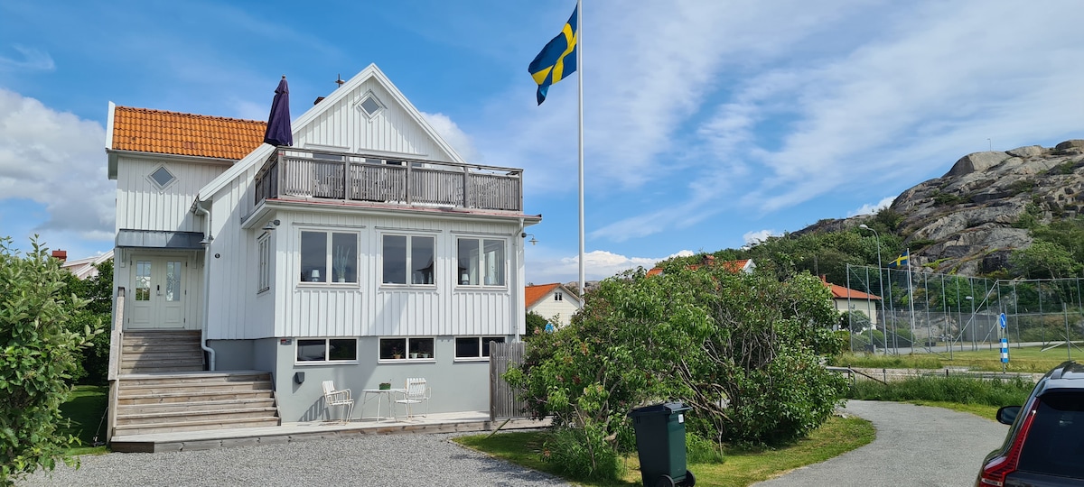 Med havet i blickfånget ligger gästhuset som byggdes 2021 på en del av vår tomt. Det finns sovplatser för fyra personer, två i sovrum med dubbelsäng och två på loftet i enkelsängar. Till gästhuset hör en vindskyddad uteplats. Här har alla årstider sin tjusning. Maj-september finns badstege från klippor 200 m bort. Det är en dryg km till kommunal badplats med bryggor. Det finns goda möjligheter till promenader/vandringar och utflykter på Tjörn. Härön skyddar mot vindarna från öppet hav i väster.