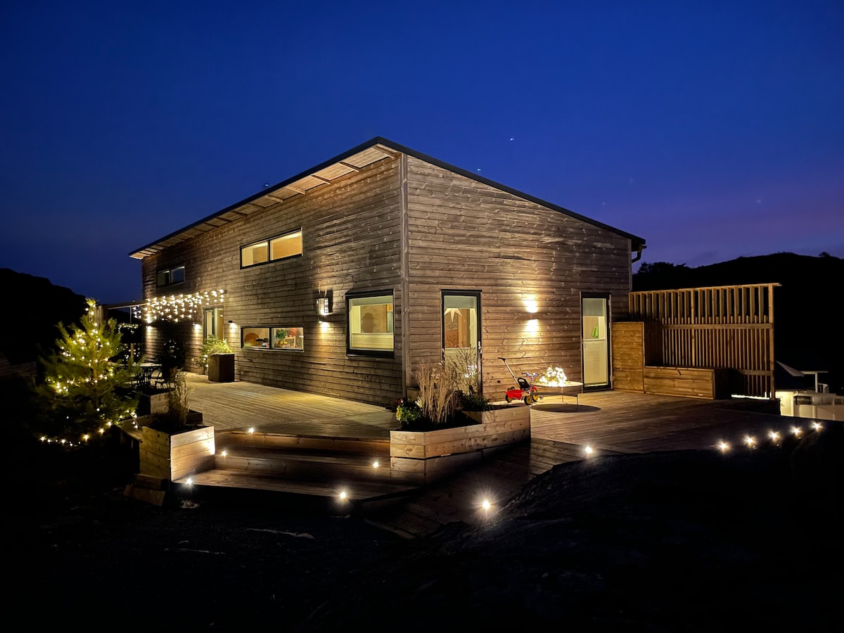 Villa Hällene ist ein modernes Holzhaus, direkt neben dem bekannten Pilane Skulpturenpark in urwüchsiger Felslandschaft gelegen. Das Haus ist hell und offen und von einer großen Holzterrasse mit Ess- und Sonnenplätzen und einer Sauna umgeben. Das Haus hat einen offenen Koch-, Ess- und Wohnbereich, der bis unter das Dach geöffnet ist. Auf einer Galerie im ersten Stock befindet sich ein zweiter großer Wohnraum. Bis zum nächsten Badeplatz sind es 10 Minuten mit dem Fahrrad (im Haus vorhanden).