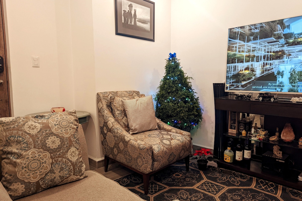 Departamento con 3 cuartos, 1 con cama matrimonial con una tv de 22" con cablevision. El otro con una cama individual y una matrimonial, con pantalla de 42" con apartado inteligente. Hay otro con cama matrimonial con tv de 22" con cable cuando pone 6 personas. Una sala, comedor, escritorio, cafetera, refrigerador, microondas, licuadora, un gym, patio y un baño completo para todo el departamento. Funcional sin lujos; sin cocina, sin estufa y sin tarja para lavar platos. No se puede cocinar.