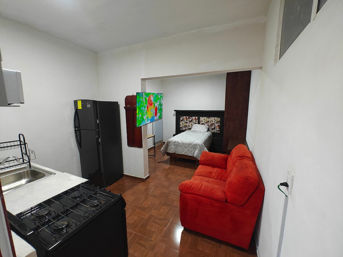 Relájate y llega a los lugares principales del Sur de la ciudad ideal para una persona, o una pareja. A solo 15 minutos de San Jerónimo, periferico, Super Via, centros comerciales, y más. Cuenta con internet rápido, lavadora disponible, Calle tranquila facil estacionarse. Todo es nuevo desde la bajilla hasta el departamento. Calle super segura, Tranquilidad y confort a buen precio. Importante: se encuentra en un 2do piso, no hay elevador. NO SE ACEPTAN MASCOTAS. interfone y cámaras de seguridad.