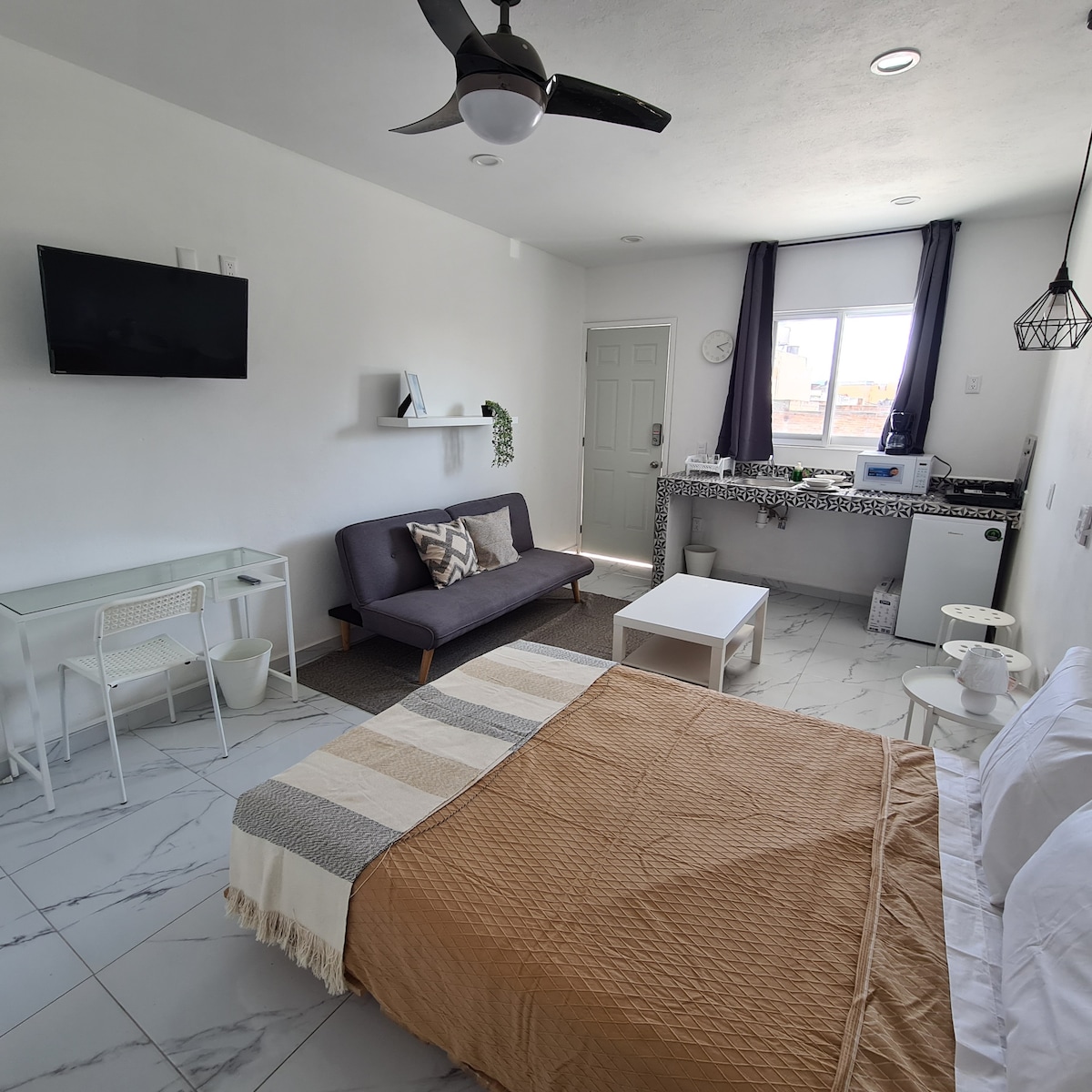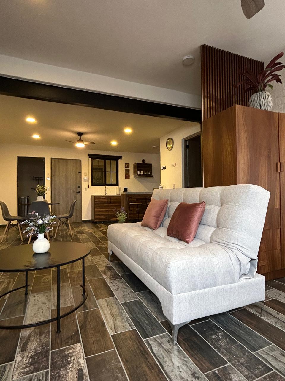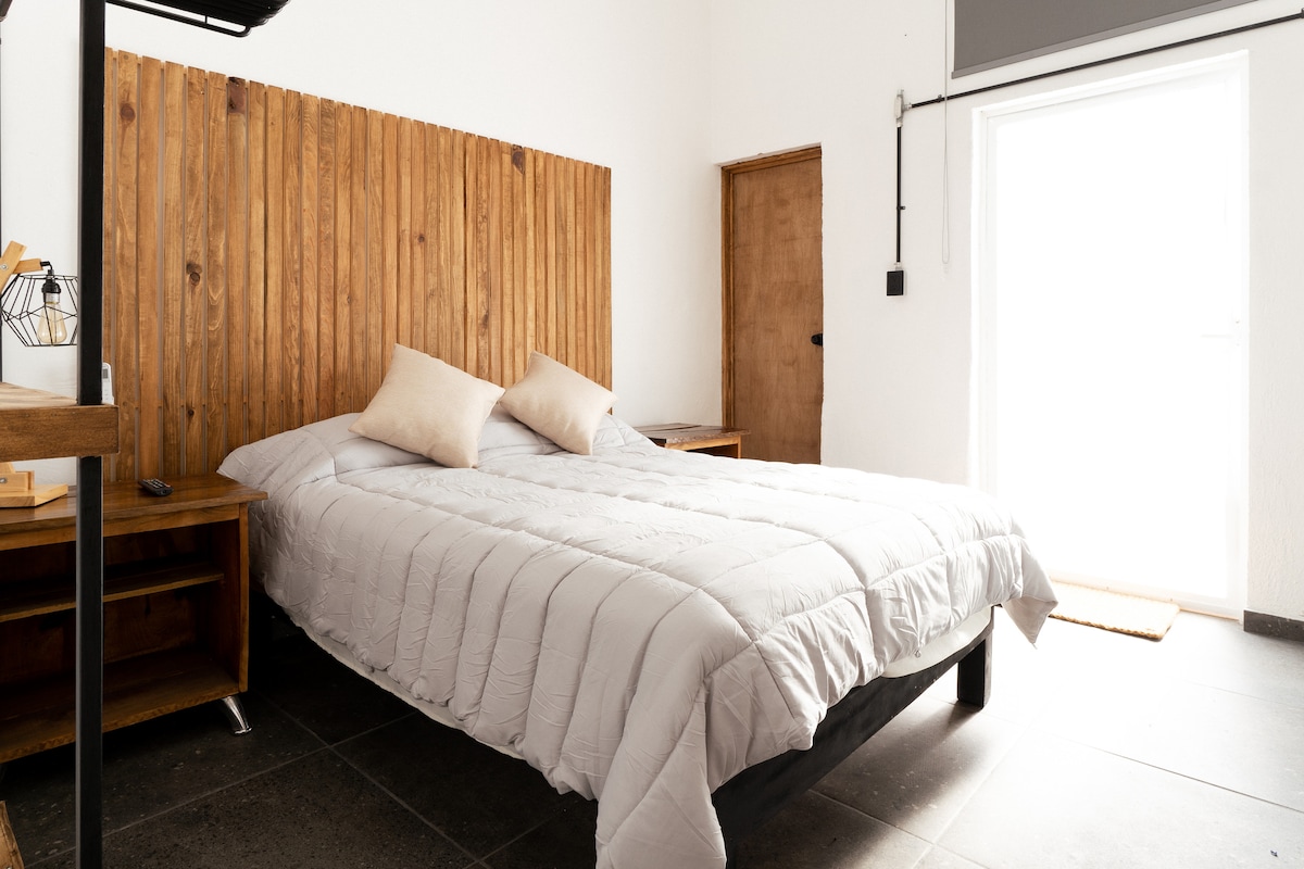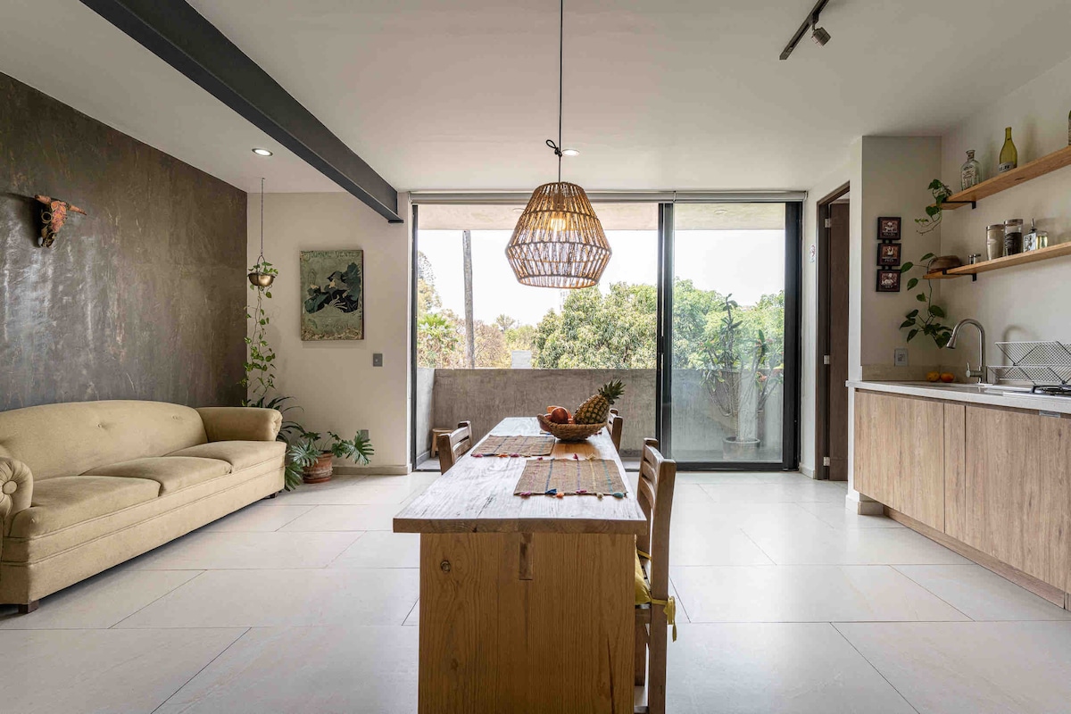 Hermoso y elegante Loft muy cerca del centro de Tlaquepaque donde encontrarás experiencias culinarias, culturales, amenidades y vida nocturna, a unos minutos caminando del tren que conecta toda la ciudad. El Loft cuenta con Aire acondicionado en habitación, área de cocina y sala, cuenta con ducha de lluvia de alta y media presión, cerradura digital, pantalla 4K, internet de alta velocidad 210 Mbps, y sensor CO2. No cuenta con cochera Disfruta de una hospedaje con estilo y elegancia