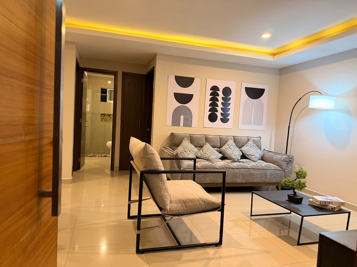 Luxurious and beautiful apartment with art deco design and furniture, relax and enjoy of the view because its in a 9th floor, it has amenities such as a scenic pool, gym, panoramic roof top, social room, bbq grills, security and elevators. The apartment has one room with a queen size bed, one full bathroom, laundry room, full kitchen, refrigerator with ice machine and cold water dispenser. We provide 2 towels for shower and 2 towels for the pool. We also offer tours to city and magic towns.