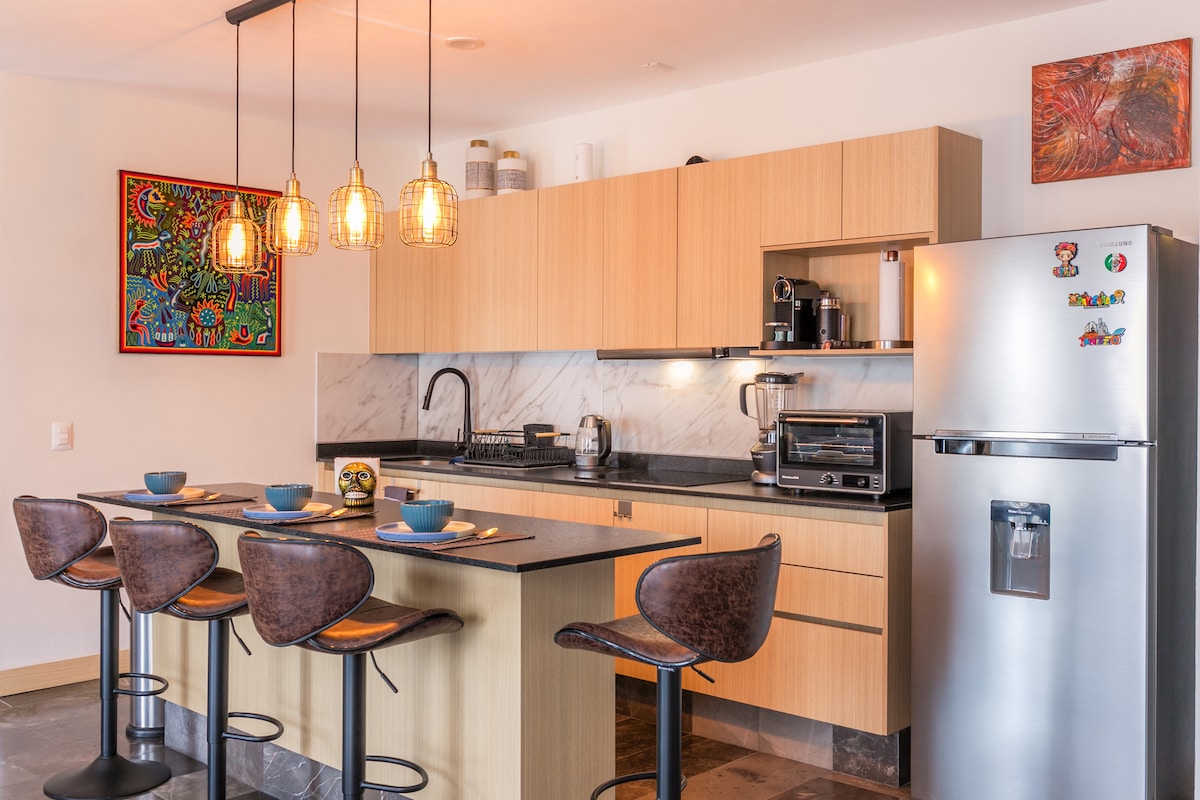 This loft is located in one of the trendiest areas of Guadalajara, but with all the comforts you need. From free parking, 24/7 security and the opportunity to walk to the supermarket or have a coffee nearby. We designed this ideal space to receive guests who want to work from home with a super internet and enjoy the city in the afternoon. The building has amenities such as a rooftop with the best 360 views of the city and an urban wall with private rooms