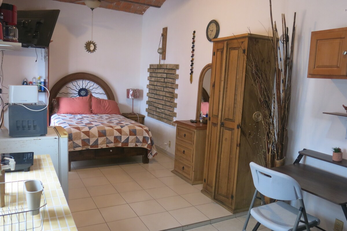 Estudio independiente, baño privado, parrilla de inducción para cocinar, 1 cama matrimonial y 1 sofa cama. TV con Netflix. Wifi. A 2 cuadras de Universidad Panamericana y Parque metropolitano. Muy cerca de Plaza Galerías y UVM, carretera a Puerto Vallarta, Periférico, Cd Judicial, estadio Akron y CODE. Aceptamos niños y mascotas. El estudio es independiente pero está al final del pasillo de la casa. Ventilador y cooler para el calor. Lea el resto de la información para asegurar su comodidad.