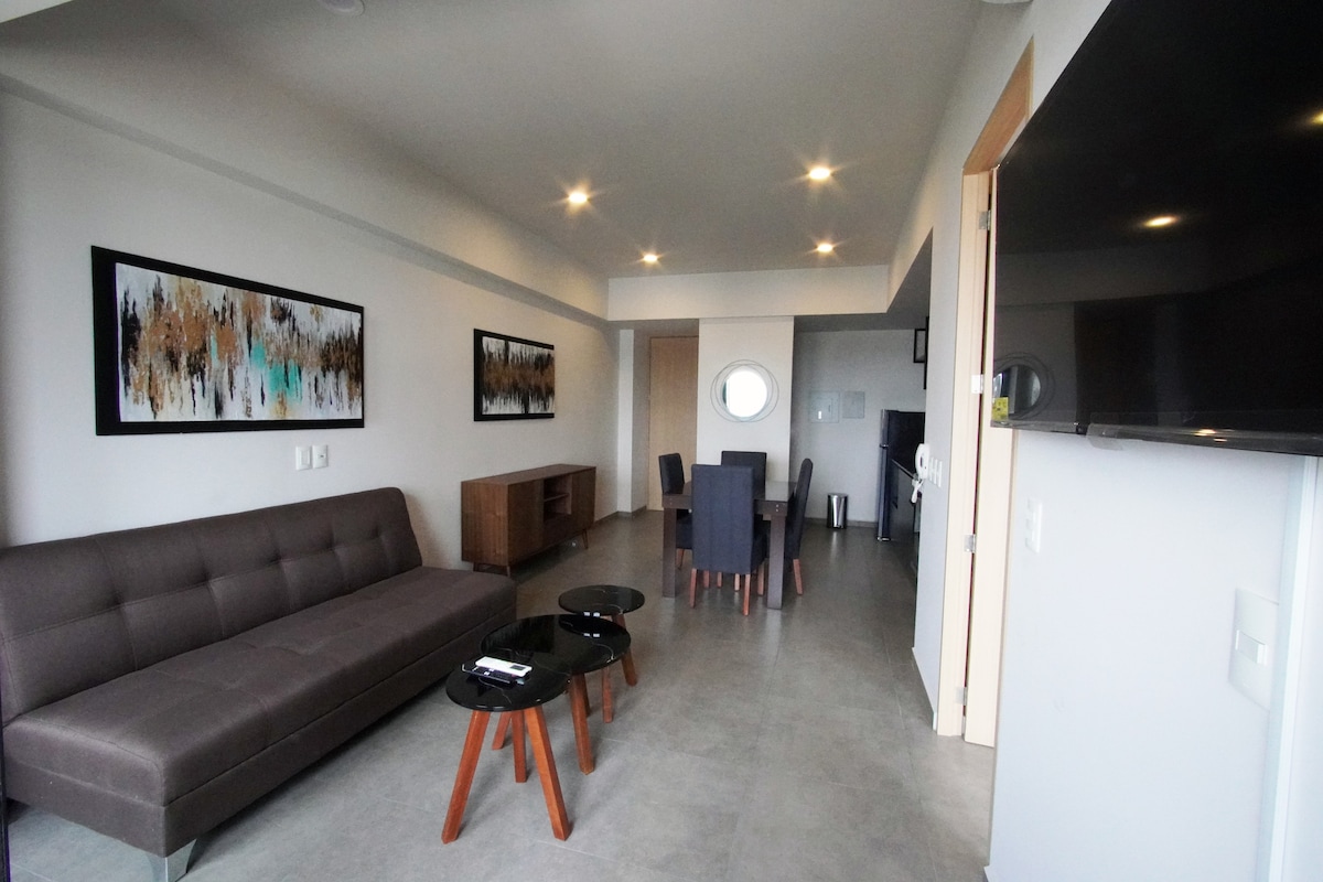 Disfruta de este céntrico y acogedor alojamiento. Cerradura práctica electrónica. Capacidad de 5 personas y 2 estacionamientos amplios. Contamos con 2 habitaciones: cuarto principal con cama king size, baño y balcón privados, y cuarto secundario con cama matrimonial (ambos con Smart TVs y amplios armarios). Sala con balcón y sofá cama. Cocina completa con todo lo necesario preparar/calentar tu comida. Amenidades (jacuzzis, gimnasio, terraza y sala de estar). ¡Descansa, convive y disfruta!