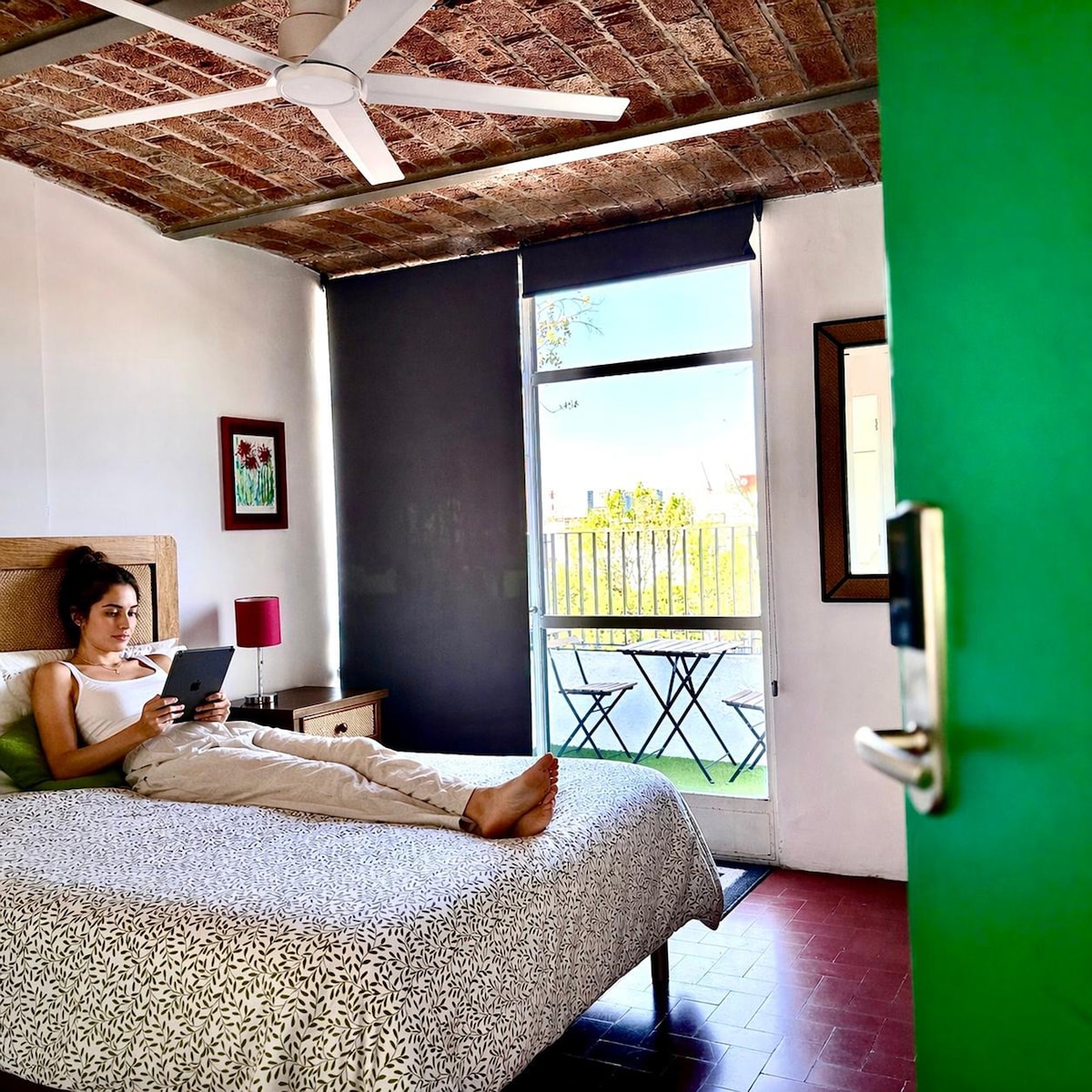 Habitación cómoda con terraza y baño privados dentro del Hostal Nube Mia. Este es un hostal céntrico, recién remodelado frente al parque Rojo en el corazón de Guadalajara. El hostal fue diseñado para que nuestros huéspedes disfruten de estar o trabajar en su espacio; brindamos servicio de limpieza diario. Los huéspedes tienen acceso a una hermosa terraza con vista a la ciudad, y a una sala de estar con tv, comedor y cocina equipada de uso común.