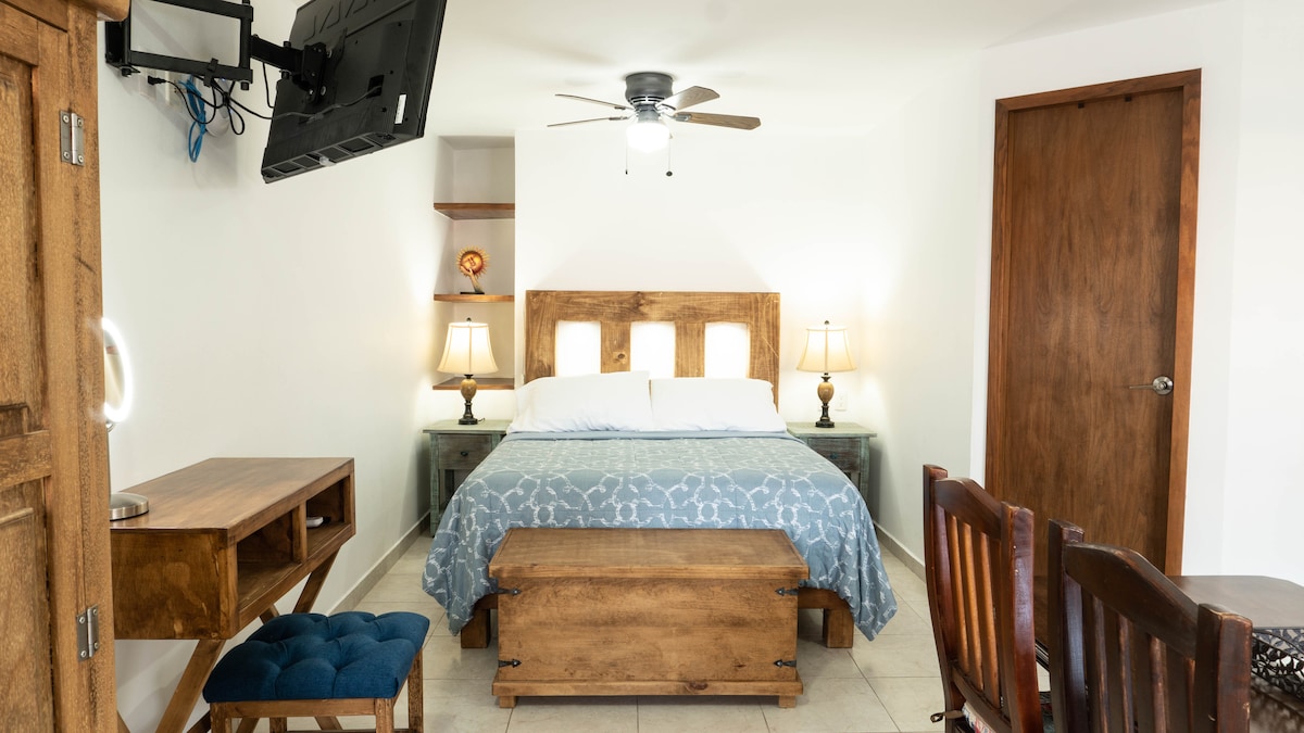 Enjoy an authentic experience in this 100% restored accommodation. We rescued its entire essence and improved it, located in the Americana neighborhood, known for its cultural and gastronomic offerings. Studio Zirahuén features: Private terrace with outdoor furniture and dining area King-size bed with high quality mattress Kitchenette with minibar refrigerator, microwave, coffee maker, blender, and wine glasses 32-in TV: Netflix HBO with your account Work desk