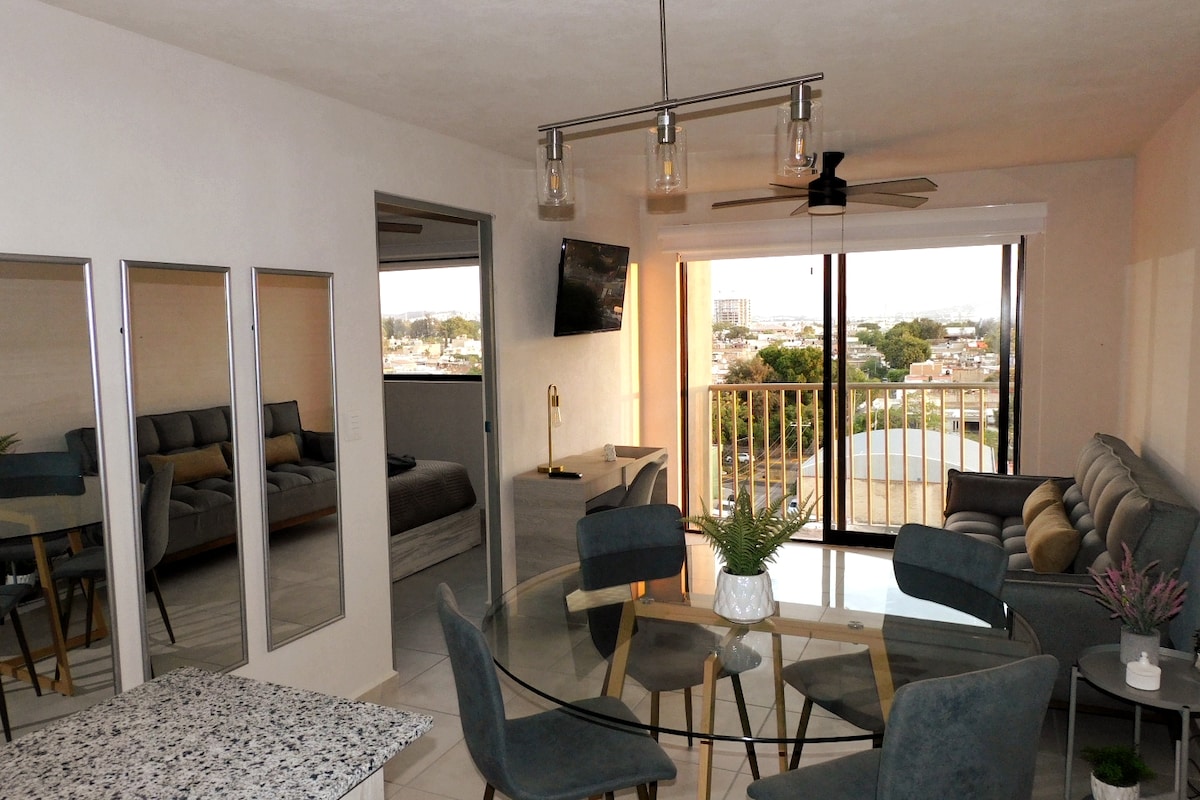 Luxurious and beautiful apartment with art deco design and furniture, relax and enjoy of the view because its in a 9th floor, it has amenities such as a scenic pool, gym, panoramic roof top, social room, bbq grills, security and elevators. The apartment has one room with a queen size bed, one full bathroom, laundry room, full kitchen, refrigerator with ice machine and cold water dispenser. We provide 2 towels for shower and 2 towels for the pool. We also offer tours to city and magic towns.