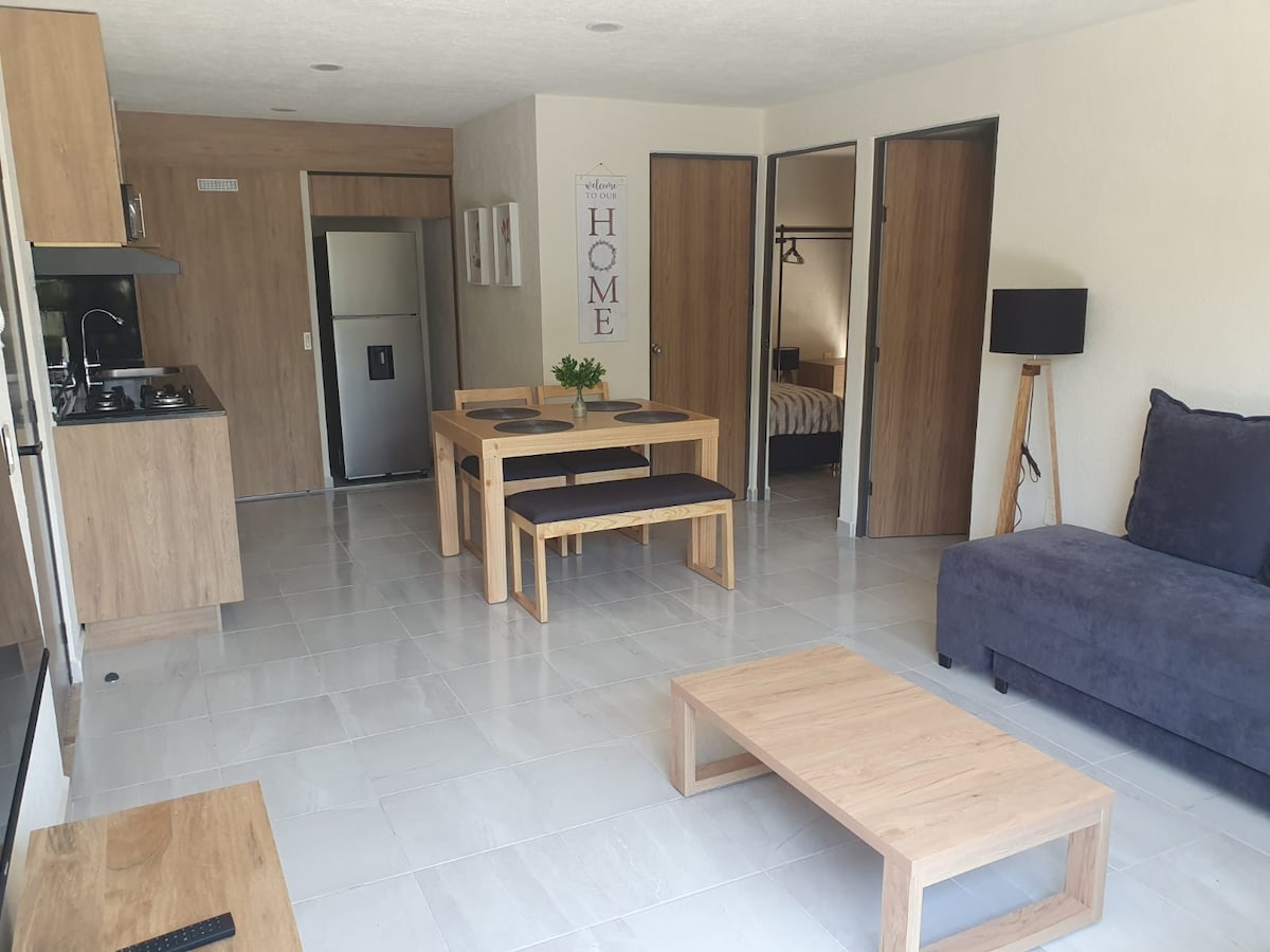 Luxurious and beautiful apartment with art deco design and furniture, relax and enjoy of the view because its in a 9th floor, it has amenities such as a scenic pool, gym, panoramic roof top, social room, bbq grills, security and elevators. The apartment has one room with a queen size bed, one full bathroom, laundry room, full kitchen, refrigerator with ice machine and cold water dispenser. We provide 2 towels for shower and 2 towels for the pool. We also offer tours to city and magic towns.