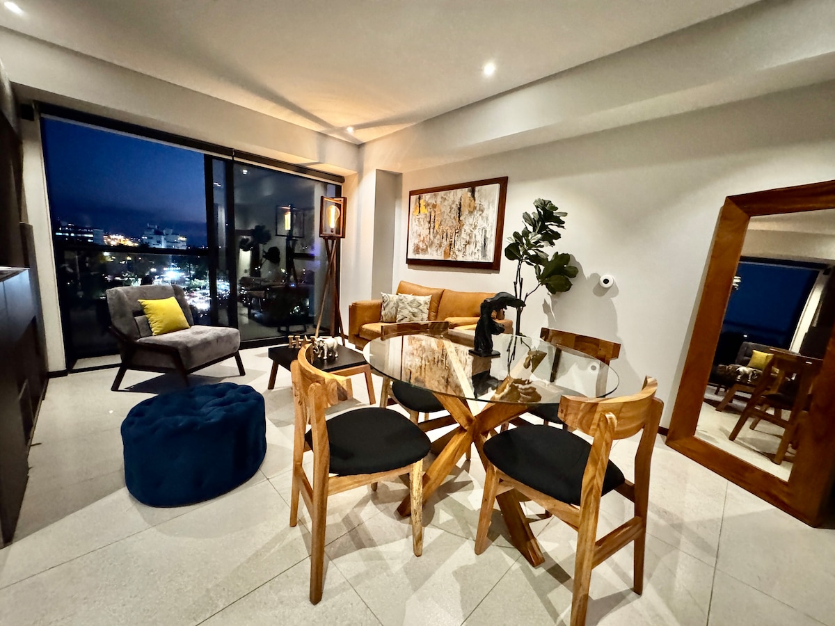 Luxurious and beautiful apartment with art deco design and furniture, relax and enjoy of the view because its in a 9th floor, it has amenities such as a scenic pool, gym, panoramic roof top, social room, bbq grills, security and elevators. The apartment has one room with a queen size bed, one full bathroom, laundry room, full kitchen, refrigerator with ice machine and cold water dispenser. We provide 2 towels for shower and 2 towels for the pool. We also offer tours to city and magic towns.
