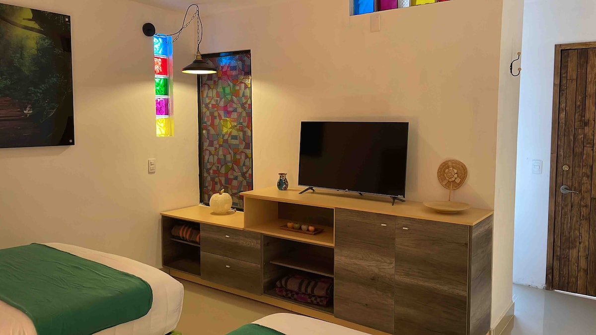 Linda habitación ideal para tres personas, espacio amplio y baño interior, se encuentra en planta baja por lo que no hay problema con subir escaleras, cuenta con espacioso armario para guardar tus cosas y siempre que quieras puedes tomar el desayuno con nosotros sin ningún costo adicional