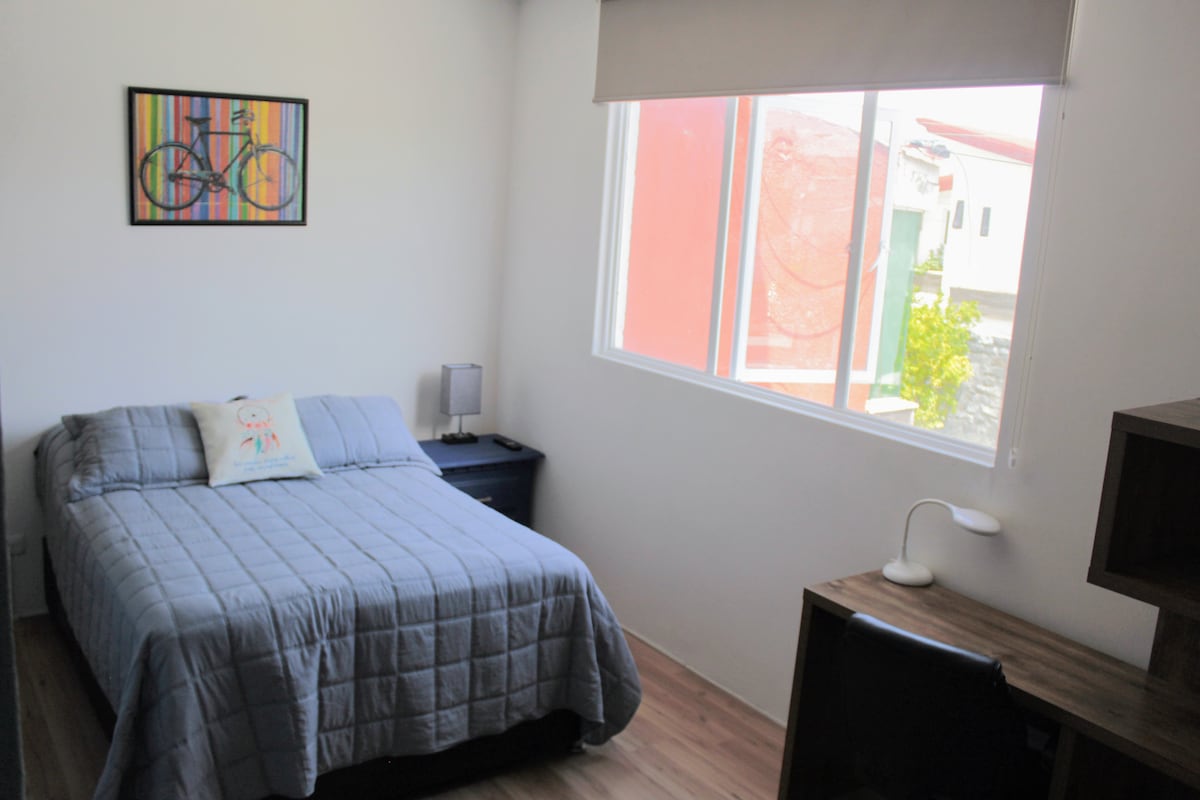 Bonita recámara con baño privado y entrada independiente. Adicional, cuenta con acceso a una cocina equipada que tiene microondas, refrigerador, sartén, platos, vasos, etc. También tiene una linda terraza donde podrás disfrutar de un rico café. Se encuentra muy cerca de CU-BUAP. Disfruta de la sencillez de este alojamiento tranquilo