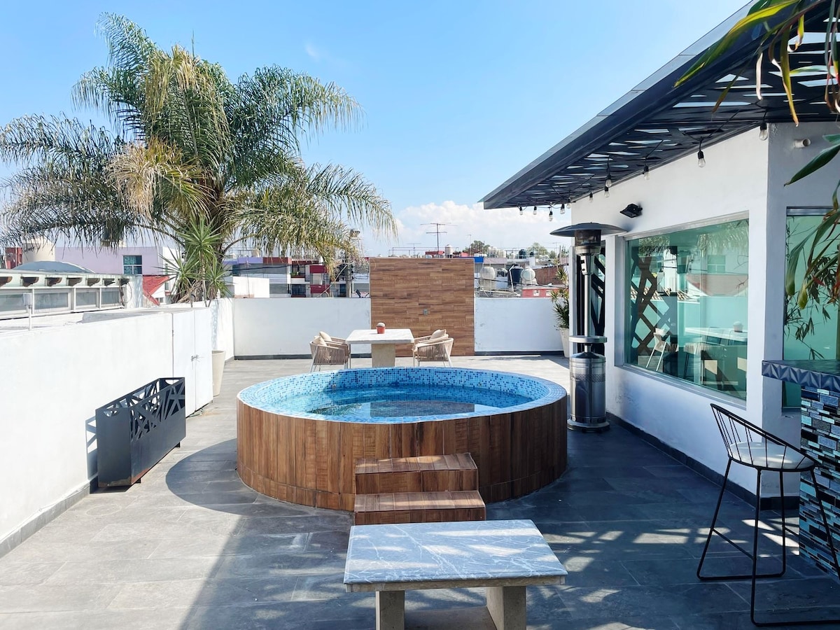 Soy Carlo, tu anfitrión! Y estaré pendiente de lo que necesites No importa el clima que haya, siempre podrás disfrutar de nuestra alberca 100% techada y climatizada, te encantará! Excelente ubicación, zona muy segura Equipado para disfrutar al máximo tu estancia Disfruta una noche de películas en la Tv de 65 pulgadas Dormirás en las nubes en colchones premium Internet de fibra óptica Entrada automática con código 24hrs, Vapor, Gym, Regaderas, Chapoteadero, 2 lugares de estacionamiento