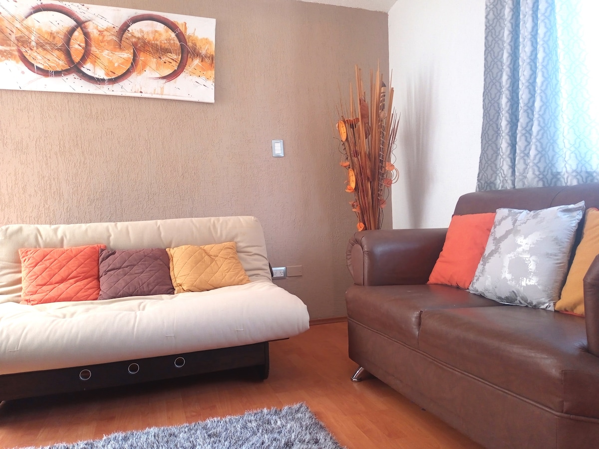 Disfruta de un espacio acogedor,tranquilo y bien ubicado al norte de la ciudad Cuenta con dos recamaras/camas matri cada uno,closet y un sofá cama mat, baño completo,sala comedor,Cocina integral,refri, Micro,cafetera,sandwichera, licuadora Wi-Fi,TV, secadora de pelo, lavadora/secadora de ropa ,estacionamiento gratuito p/auto Se proporciona café soluble,azúcar,crema, jabón para baño y manos, únicamente de bienvenida El departamento cuenta con trastos y utensilios de cocina, pero no lavatrastos
