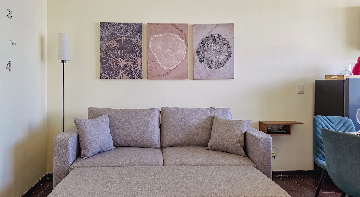 Luxury loft with terrace in Sonata Towers, Lomas de Angelópolis. Features a bedroom with a double bed, plush closet, TV, and a full bathroom with premium fixtures. The living area includes a sofa, dining area with microwave, frigobar, coffee station, and desk. Enjoy covered parking, valet service, and room service from the in-building restaurant. Steps from the vibrant Sonata District—shops, dining, and cultural activities. Ideal for business or leisure, with 24-hour security for a safe stay.