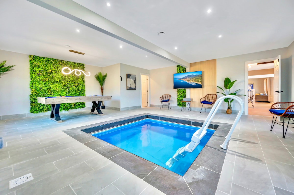 Escape to a cozy fall getaway near Kalahari, Mount Airy Casino, Crossings Outlets, Lake Wallenpaupack, & Tobyhanna State Park 2 miles away w/ fall foliage, & mountain air, lake views, wildlife, & picnic spots. Nestled off a rugged private road. This spa style retreat has a soaking tub, rain shower, smart lights, kitchen w/ smart stove, plush beds, LED mirrors w/ music sync, & retro arcade fun. Perfect for couples, birthday getaways or families seeking a peaceful Poconos stay w/ modern amenities.