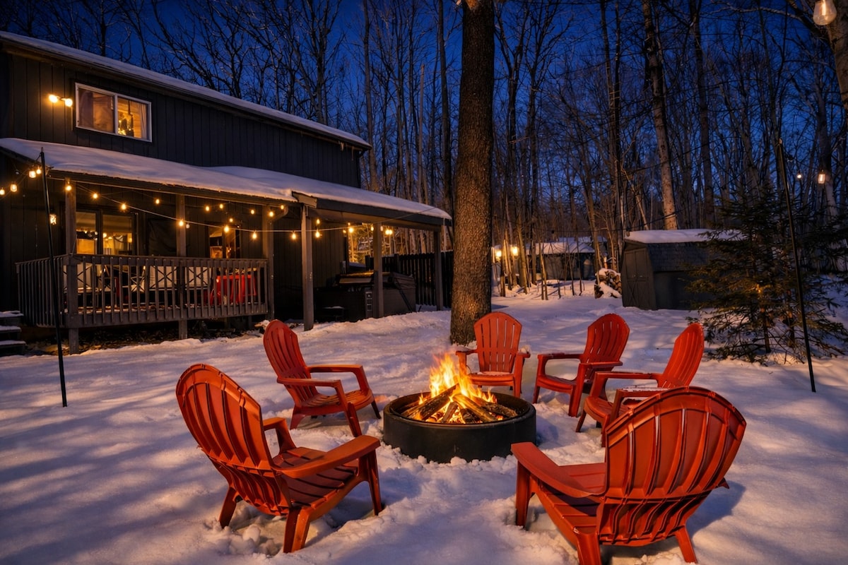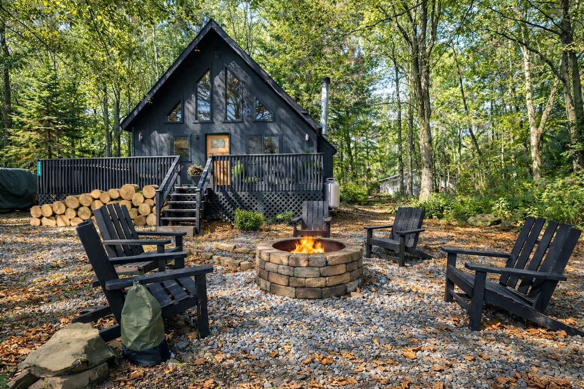 Immerse yourselves in the perfect blend of serenity and romance at our fully renovated Poconos log cabin. It offers a private feel, while located in a safe neighborhood. Cuddle up in our living room day bed while enjoying backyard forest views through the giant picture window. Relax in the hot tub or by the fire pit where memories are made! Centrally located, the cabin provides access to ski resorts and hiking trails. As guests, you'll also enjoy access to the lake, pool, and sports courts.