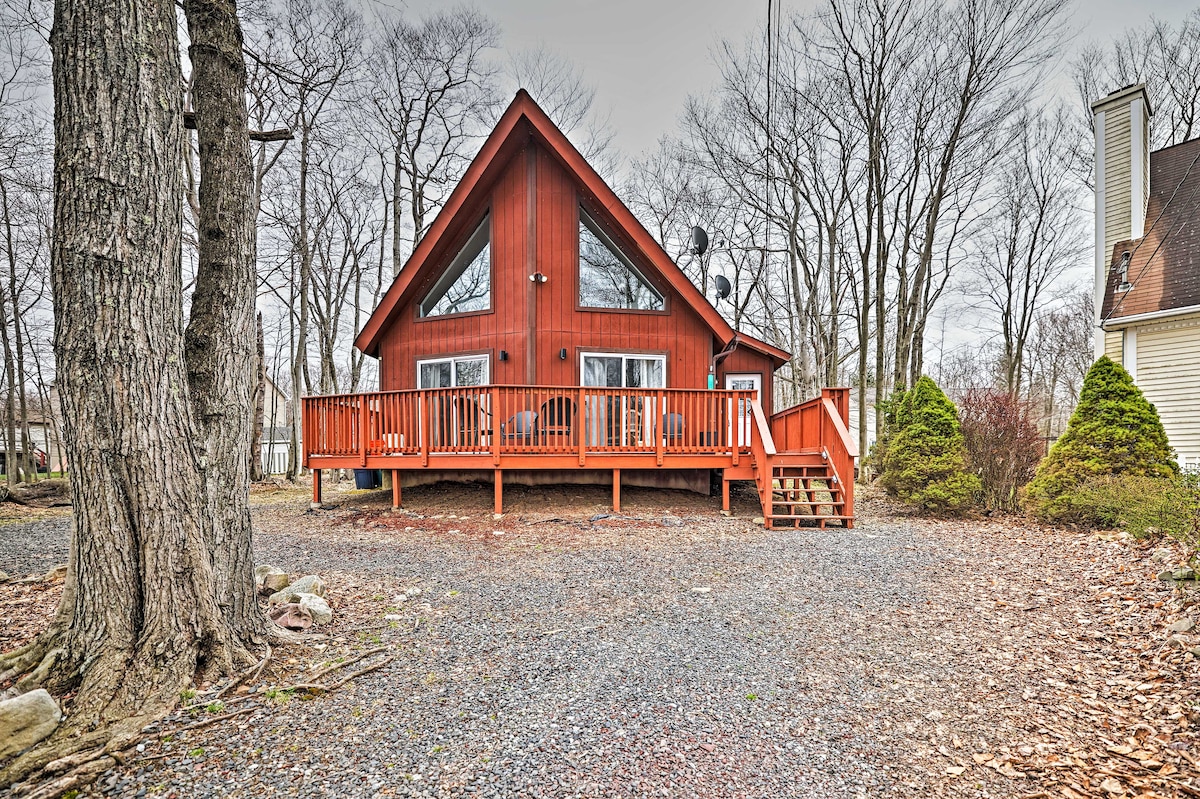 Walk to Beaches | Community Amenities | 8 Mi to Pocono Raceway Book this Long Pond vacation rental cabin for your next summer retreat in the mountains! Nestled in the Emerald Lakes community, 'The Blue House' provides 3 bedrooms, 2 baths, and everything needed for a fun-filled getaway. Hike in Big Pocono State Park, enjoy Camelback Resort's outdoor waterpark and zip-line course, or swim in the community's private lakes and pools. Afterward, relax on the deck and make s'mores by the fire pit.