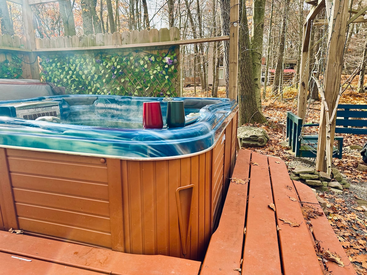 New 7 SEAT HOT TUB! In the heart of Pocono Mountains a newly renovated, modern, spacious & family-friendly chalet in an amenity filled community Private 3000sqft 4bed3bath home located on 1.5acres backing up to a nature preserve Enjoy the sauna, hot tub, game room, fireplace, fire pit We are in a community with 5lakes, 3beaches, fishing lake, 2pools, playgrounds, tennis & basketball courts Minutes from bird watching, hiking, wineries, skiing, indoor water parks, golfing & casinos