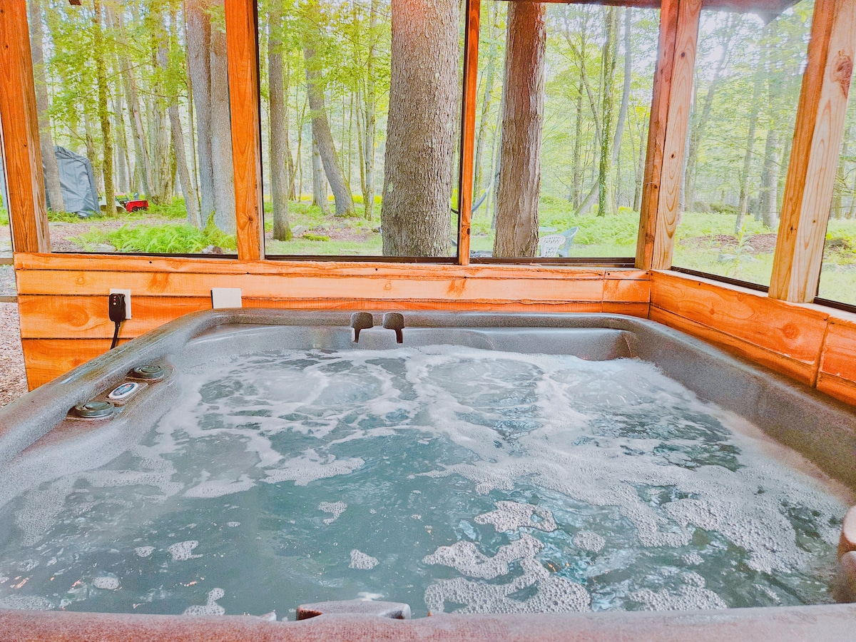 Immerse yourselves in the perfect blend of serenity and romance at our fully renovated Poconos log cabin. It offers a private feel, while located in a safe neighborhood. Cuddle up in our living room day bed while enjoying backyard forest views through the giant picture window. Relax in the hot tub or by the fire pit where memories are made! Centrally located, the cabin provides access to ski resorts and hiking trails. As guests, you'll also enjoy access to the lake, pool, and sports courts.