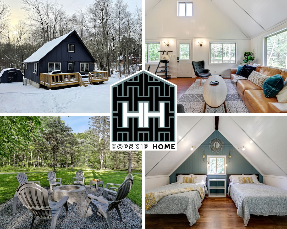 Welcome to Skylight Chalet: Escape to our serene A-frame cabin located in the tranquil woods of the Pocono Mountains. Situated on nearly an acre of lush forest & boulders our retreat offers a perfect balance of comfort, coziness, and relaxation. Unwind in the hot tub beneath the stars, rejuvenate in the sauna, or gather around the fire pit for cozy evenings with friends & family. Whether you seek adventure or peaceful relaxation, our cabin provides a serene sanctuary for your getaway.