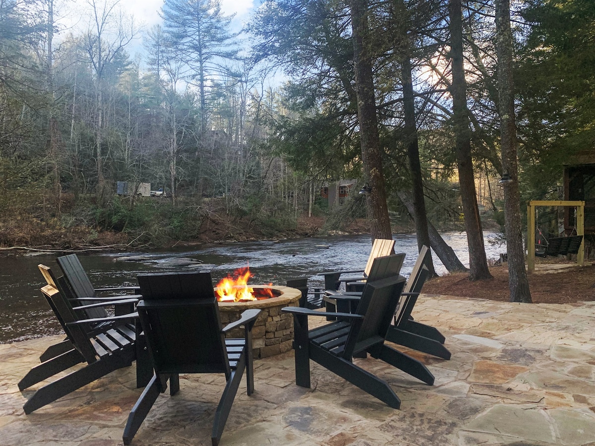 As Seen on "Trips to Discover"! Cozy, modern & rustic cabin in the Aska Adventure area across the street from the Toccoa River. Swing on the porch or enjoy the outside fire pit while listening to the river. Cook a meal in the open kitchen, dine at 2 eateries within walking distance or travel to Blue Ridge or Ellijay and visit the many great restaurants. Tubing, kayaking, gem mining are next door. This cabin is on a paved road and only 10 minutes from town. Fannin County STVR #1599.
