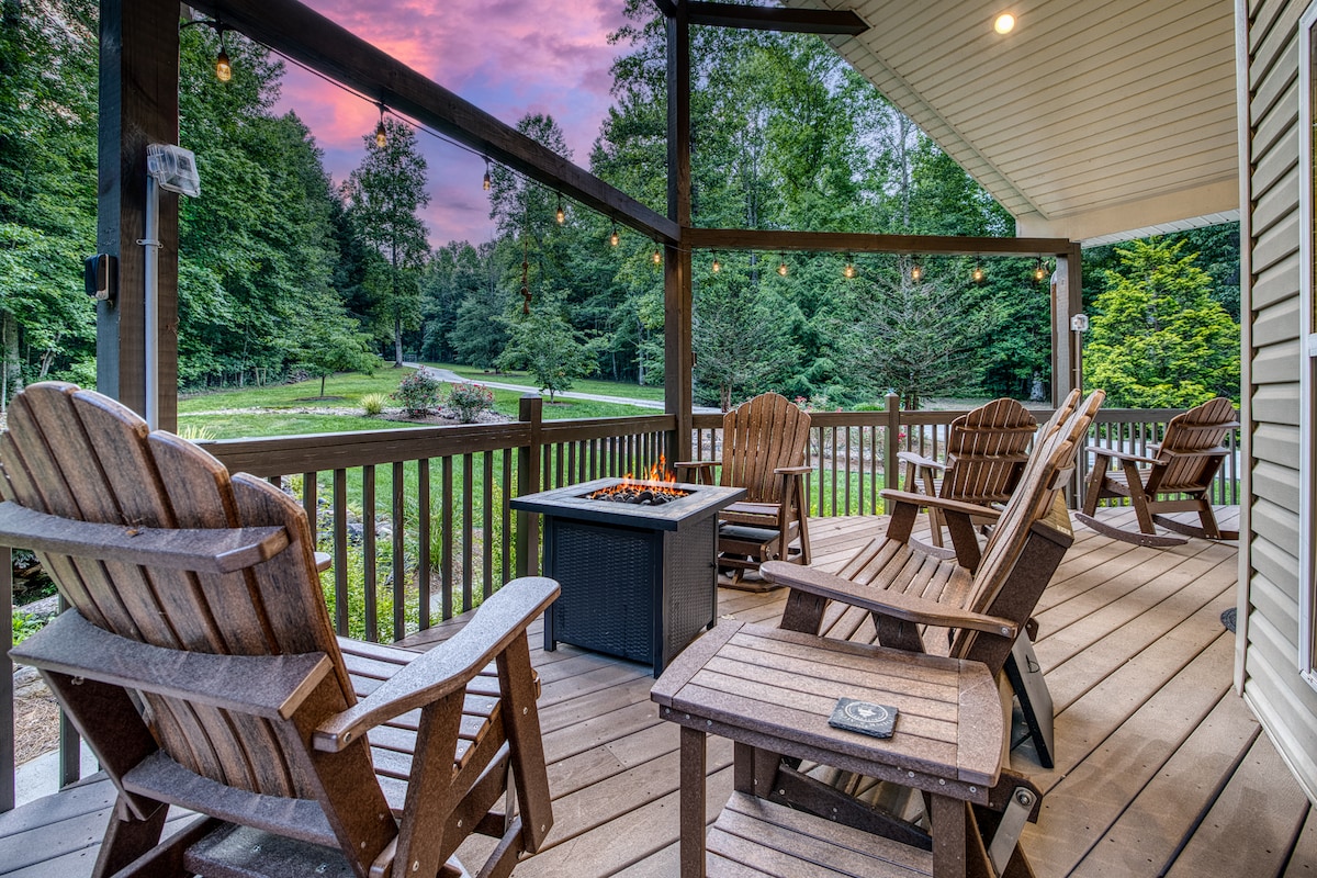 LUXE Chalet! Hot Tub, Sauna, Arcade, 3 King, Creek