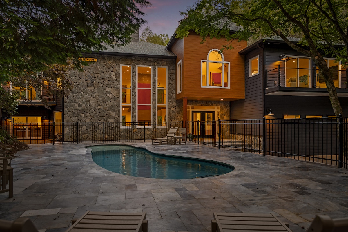 Escape to Driftwood Rapids Villa, a stunning 6,300 sq. ft. modern retreat on Fightingtown Creek. Enjoy riverside serenity with luxurious bedrooms, a gourmet kitchen, heated pool, hot tub, sauna, and endless games. Fish, explore nearby Blue Ridge, or relax on spacious decks. Perfect for families or groups, this unforgettable North Georgia oasis promises peace, adventure, and lifelong memories.