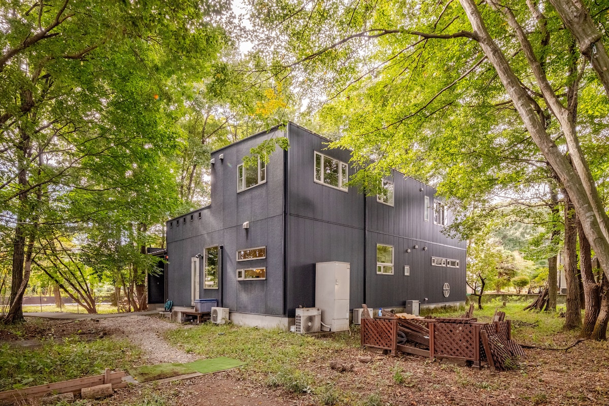 森林の中にひっそりとたたずむ、あなただけの大人の隠れ家。那須高原スマートICから信号・渋滞の少ない一般道で12分と高アクセス。 那須主要観光地から車で15分とアクセスも良い。 中心部より標高が高いため、都心より10度ほど気温が低い。エアコンなしでも夏は涼しく過ごすことができる。 広々としたテラスに燦々と降り注ぐ陽射しが、家族や仲間と過ごす楽しいひと時。 外には、特大なBBQスペース。テーブルにははシェード、ソファーにはパラソルが設置され、森の中でゆっくりとお過ごしいただけます。 広々としたリビングダイニングに120インチの4Kシアターを完備、雨の日も室内で楽しむことができます。 外では、タッチオーブン使用可能な75cm大型のファイヤーピットを完備。火のゆらぎに心を休めながらゆっくりと滞在、非日常を味わう特別な空間を堪能。壁や床に使用した自然木と四方どこを見ても緑の世界。緑の美しさにリラックスしてお過ごし下さい。 駐車場が4台対応可能、5台目相談可能。