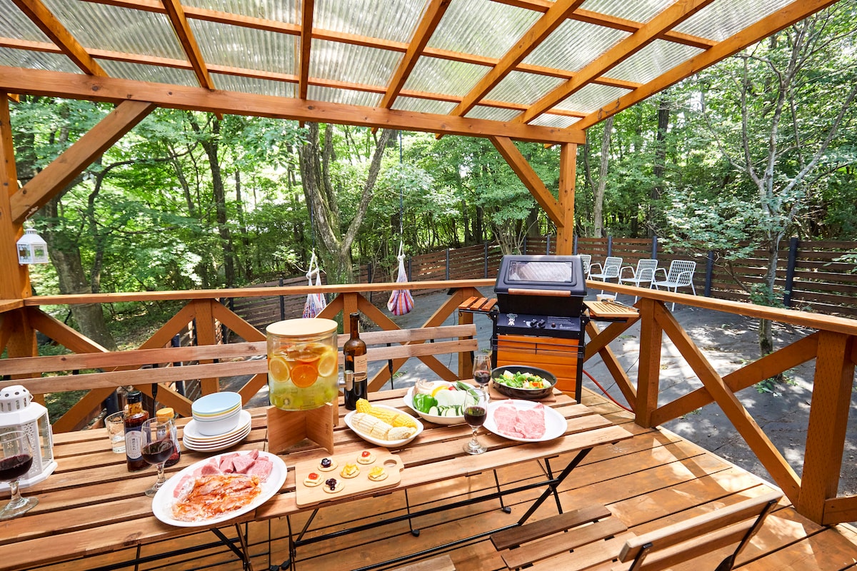 森林の中にひっそりとたたずむ、あなただけの大人の隠れ家。那須高原スマートICから信号・渋滞の少ない一般道で12分と高アクセス。 那須主要観光地から車で15分とアクセスも良い。 中心部より標高が高いため、都心より10度ほど気温が低い。エアコンなしでも夏は涼しく過ごすことができる。 広々としたテラスに燦々と降り注ぐ陽射しが、家族や仲間と過ごす楽しいひと時。 外には、特大なBBQスペース。テーブルにははシェード、ソファーにはパラソルが設置され、森の中でゆっくりとお過ごしいただけます。 広々としたリビングダイニングに120インチの4Kシアターを完備、雨の日も室内で楽しむことができます。 外では、タッチオーブン使用可能な75cm大型のファイヤーピットを完備。火のゆらぎに心を休めながらゆっくりと滞在、非日常を味わう特別な空間を堪能。壁や床に使用した自然木と四方どこを見ても緑の世界。緑の美しさにリラックスしてお過ごし下さい。 駐車場が4台対応可能、5台目相談可能。
