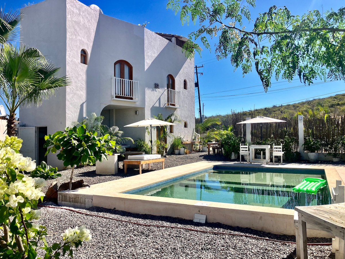 Welcome to "The Wave", a beautiful retreat in Todos Santos. Our unique location is a short walk from restaurants, art galleries, organic farms, world class yoga, and more. The nearest beach is about a half mile away. You'll love relaxing in the pool and outdoor soaking bath at The Wave while taking in views of the surrounding organic gardens. The cozy casita is good for couples, solo adventurers, and business travelers.