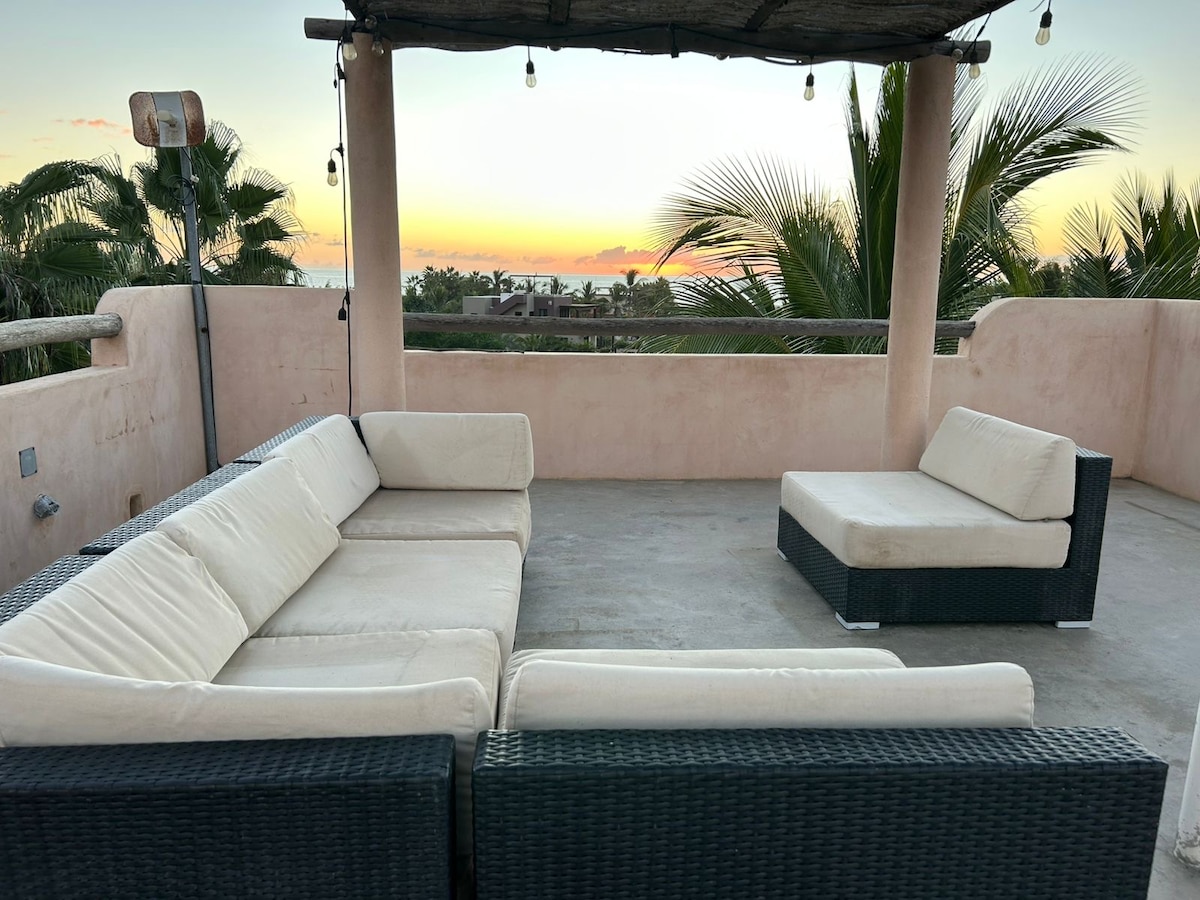 Enjoy this beautiful recently completed Penthouse with 2 bedrooms and 3 bathrooms located just a few blocks from famous Cerritos Beach.....considered the safest swimmable beach in Baja. Perfect for all ages. You will enjoy indoor-outdoor living at its best with large outdoor spaces on 2 levels. All appointed with high end furnishings, top of the line appliances and 75" TV and Sonos sound system. The very private rooftop deck has an unobstructed view of the beach and the Pacific Ocean.