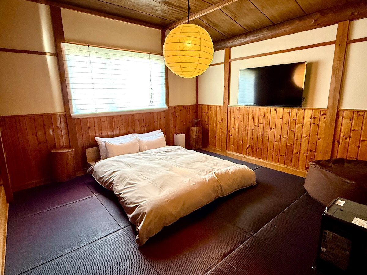 Located an 8-minute walk from the Ryotsu Port Terminal of Sado Kisen Steamship, the house can be rented out for a maximum of 8 people. Please be assured that this is not a type of accommodation shared with other guests. There is a living and dining space, a sauna, a Jacuzzi, and a fully equipped kitchen so you can cook. There are four bedrooms. Each room has 2 single beds, for a total of 8 beds.
