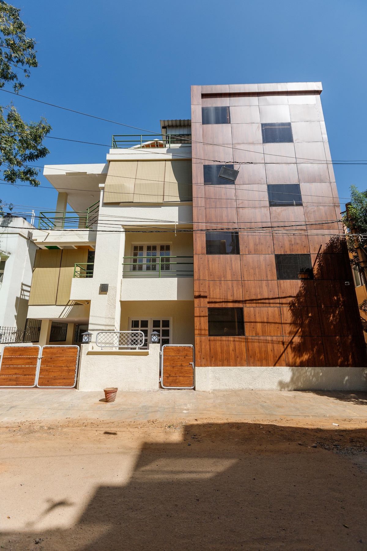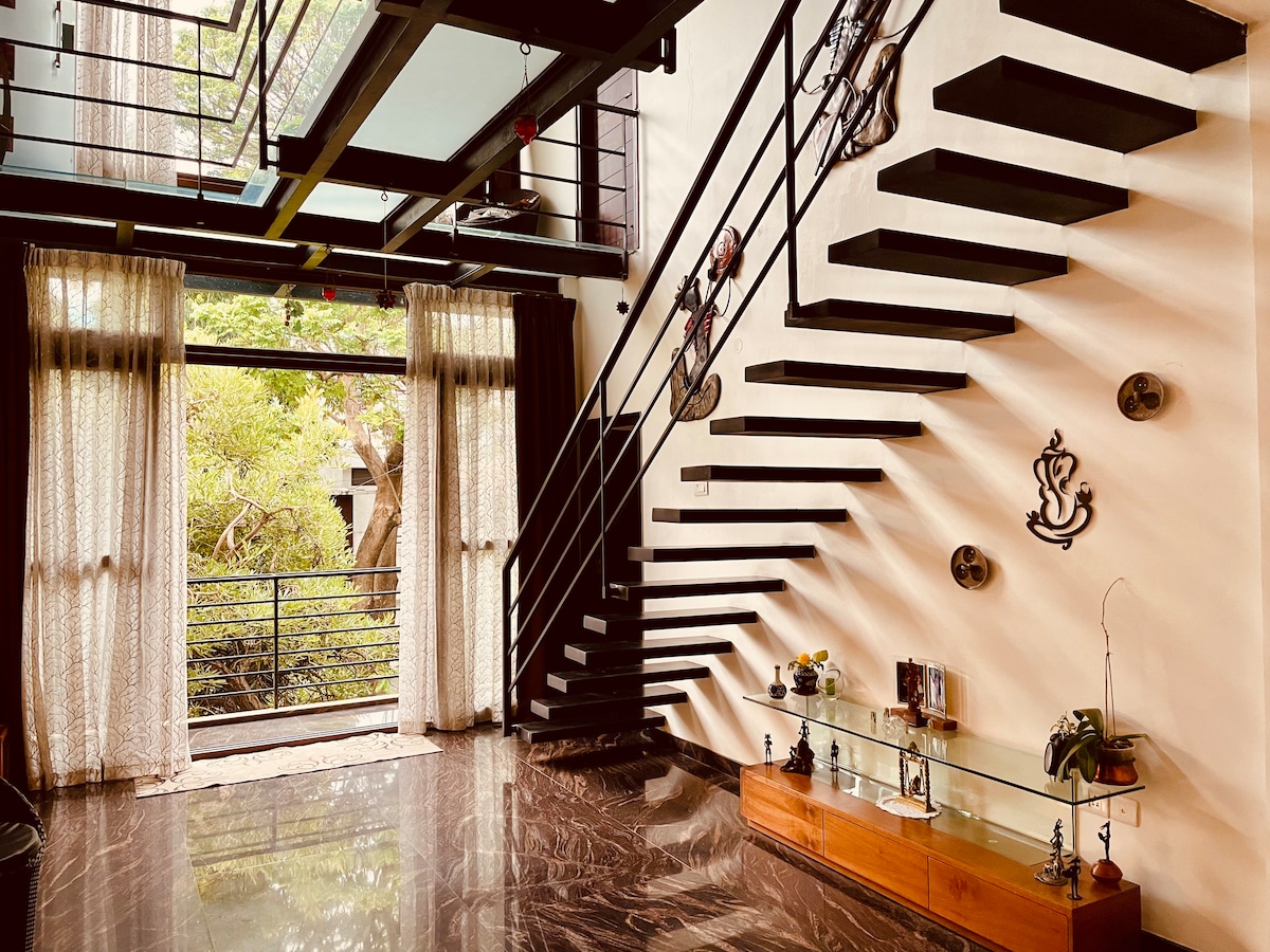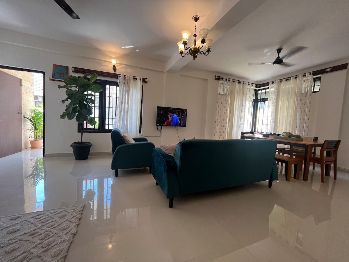 A spacious 1-bedroom studio in the heart of Indiranagar with a private balcony, potted plants, a mango tree, and a kitchen. Thoughtfully designed - minimal, homely style - filled with natural light and quiet charm. A 1 min walk from the metro and some of Bangalore’s best cafés. An extension of our calm way of life — ideal for solo travellers, couples, and work trips. Birds and butterflies often drop by to say hello. Includes King bed Wi-Fi+workspace Modern bath Kitchenette with essentials only