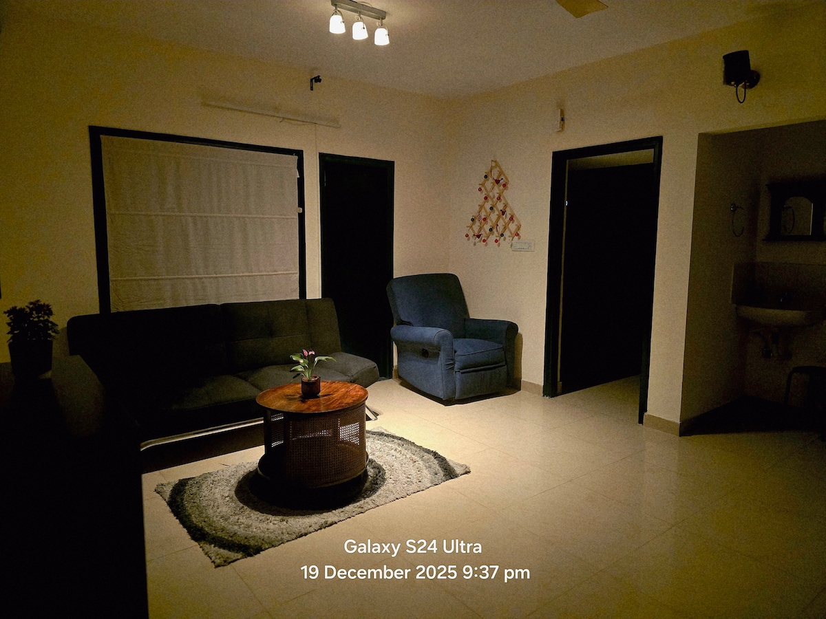 Brutalist Architecture meets a touch of modernism in this breathtakingly beautiful 3 BHK Apartment located just a few meters away from the famous Sony World Signal at Koramangala. It is designed with impeccable attention to detail to maintain a balance between styling and comfort. It has all the required amenities like a full fledged kitchen, ACs, wifi, Bar counter, power backup, wet and dry bathrooms, elevator, 2 balconies and covered car parking. The huge plants do add life to this place.