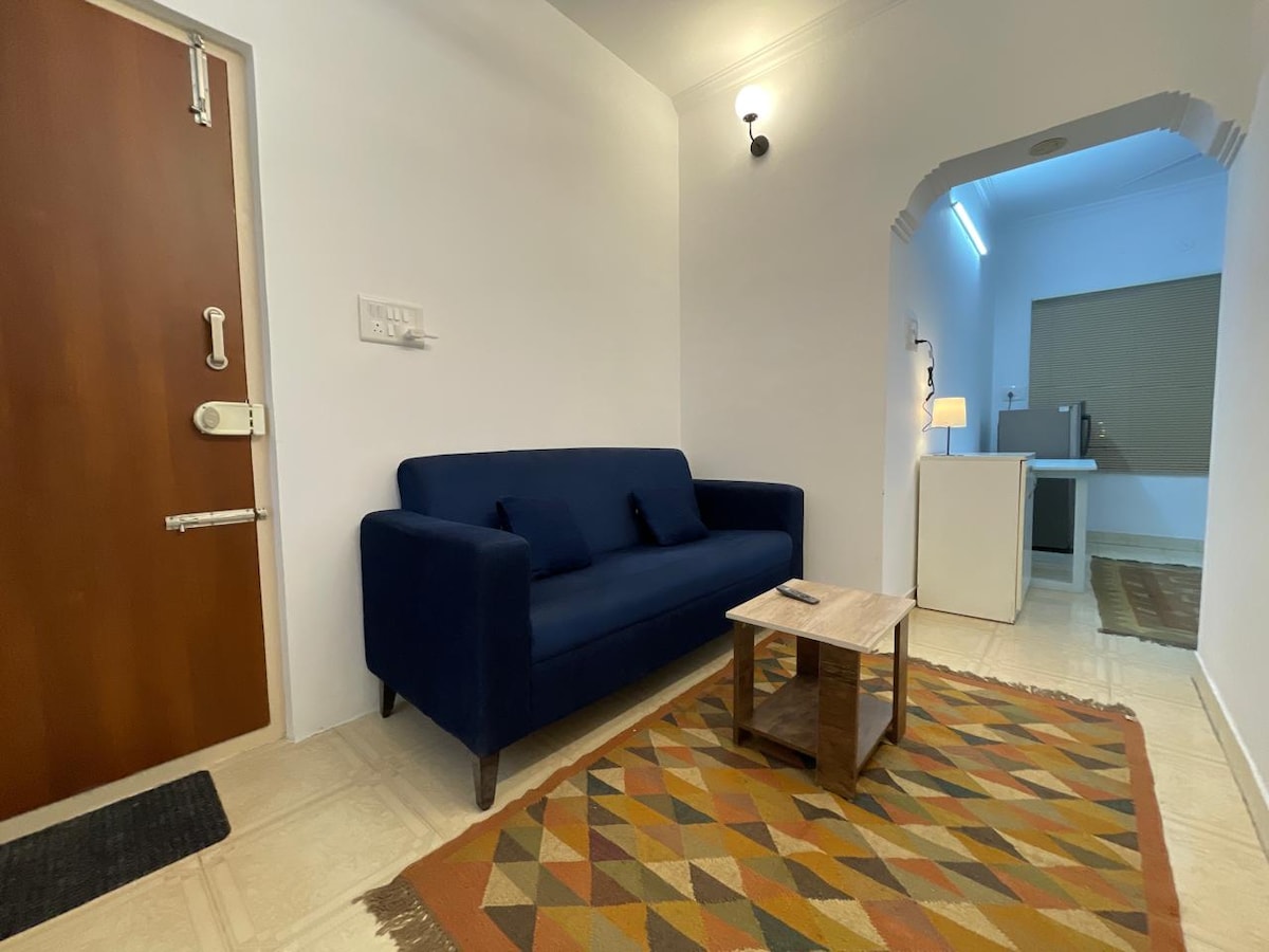 Spacious 600 square feet Designer 1BHK Suite with Private Balcony | High-Speed fibre optic Wi-Fi & Smart TV with streaming platforms, Work/Dining Desk, 24/7 power backup for uninterrupted work and comfort |Luxe King Bed & Orthopaedic Mattress ,wooden wardrobes for storage | fully equipped Kitchenette | Couch Bed in living room , Max.Occupancy 4 | Elevator access, professional housekeeping and access to paid laundry on site for long stays| Located in Central Bangalore | LGBTQIA++ Affirmative