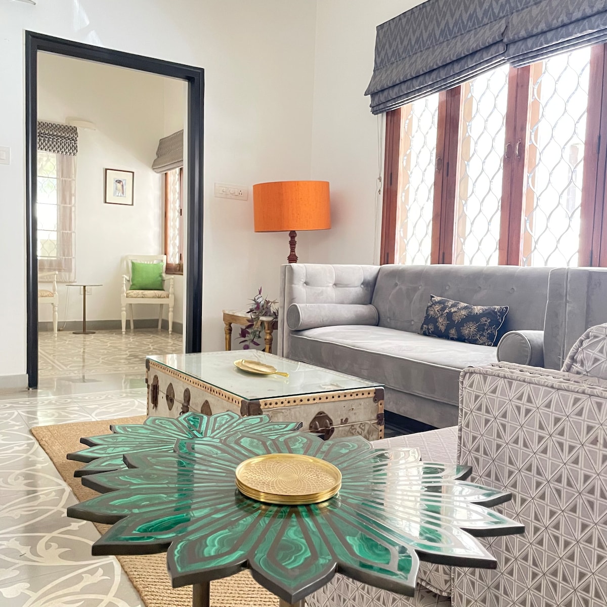 Experience the charm of a French Provencal-inspired roadside apartment, perfectly located on Indiranagar's vibrant 100ft Road in the heart of Bangalore. With stone floors, high-beamed ceilings, and elegant antique details, this beautifully designed space exudes luxury and warmth. Bask in natural light as you relax, or step outside to explore the bustling neighborhood. You'll find a variety of shops, cafes, and restaurants just a short stroll away, offering the ultimate convenience for your stay