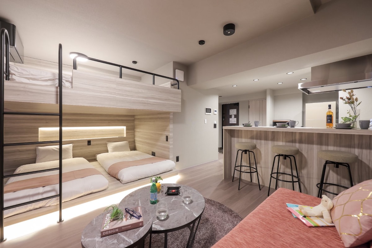 入住這間位處中心地段的房源,全家到哪都方便。 房內配置兩張加大雙人床,適合家人、朋友一同入住 床距舒適,動線保有獨立空間。最多可住5人 開放式廚房備有電磁爐、鍋具與碗盤,想吃家常菜、日式簡單料理都不是問題 吧台連接生活與用餐空間,不論是一杯早晨咖啡,還是一頓晚餐,一切都剛剛好。 洗手台與衛浴獨立設計,幾個人一起住也能保有自己的步調 提供藍芽音響,在日本的夜晚聽著音樂、泡個熱水澡是旅途中最放鬆的片刻。 房內備有投影機,可輕鬆連接常用的數位串流平台 洗衣機、空氣清淨機、熨斗與寬敞衣櫃一應俱全,你需要的,我們都準備好了 空間剛剛好,適合一個人靜靜地在吧台工作,也適合和朋友或家人一起住上幾天 自在相處,各自舒適。