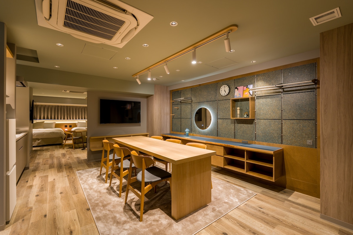 入住這間位處中心地段的房源,全家到哪都方便。 房內配置兩張加大雙人床,適合家人、朋友一同入住。 床距舒適,動線保有獨立空間。最多可住5人。 開放式廚房備有電磁爐、鍋具與碗盤,想吃家常菜、日式簡單料理都不是問題。 吧台連接生活與用餐空間,不論是一杯早晨咖啡,還是一頓晚餐,一切都剛剛好。 洗手台與衛浴獨立設計,幾個人一起住也能保有自己的步調。 提供藍芽音響,在日本的夜晚聽著音樂、泡個熱水澡是旅途中最放鬆的片刻。 房內備有投影機,可輕鬆連接常用的數位串流平台。 洗衣機、空氣清淨機、熨斗與寬敞衣櫃一應俱全,你需要的,我們都準備好了。 空間剛剛好,適合一個人靜靜地在吧台工作,也適合和朋友或家人一起住上幾天。 自在相處,各自舒適。