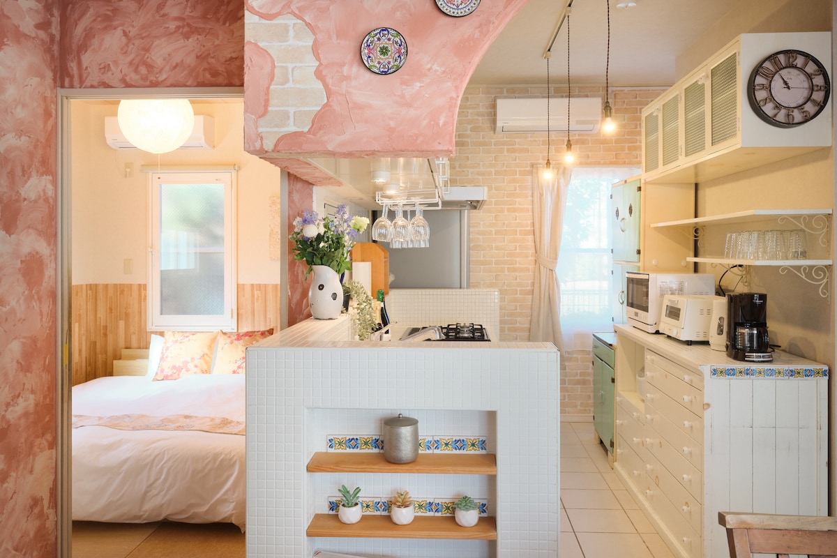 7Rooms Hotel & Cafe is a cozy floral hideaway, just 7 minutes from Kasai Station. Each room features a kitchen, fridge, washer, bathtub, and separate toilet—perfect for long stays. Enjoy handmade wood furniture, retro-pop decor, and full amenities. A peaceful park is just outside, and 24hr supermarkets are nearby. Shared appliances like microwaves are available. A flower shop and café await downstairs, with breakfast available (extra charge).