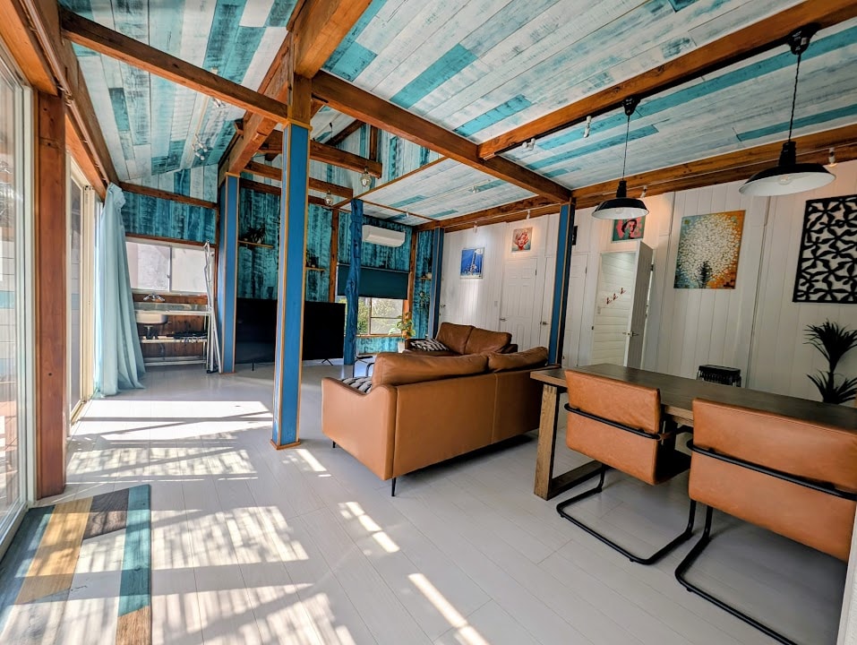 1st floor with open-plan kitchen, bar area, dining area, lounge and outside BBQ space that is 100m from Sotoura Beach, Shimoda's most popular family beach. On top of the unique beach-house design, guest can enjoy a new bathroom, professional stove, Weber BBQ, 85 inch smart TV with new air conditioners and beds in every room. Aqua house has its own parking for 2-3 cars in front of the house.