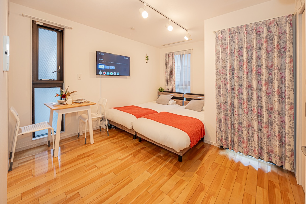 东京・墨田区|安静街角的四楼雅致房源|洋式风格/日式榻榻米结合体|近浅草寺・晴空塔 在喧嚣城市的一隅,藏着一间静谧的小屋。 走进这间位于四楼的日式与洋式结合的公寓,仿佛回到了属于自己的小小世界。 房间格局 ・在这间雅致的401号房,卧室独具特色,满足多样居住需求 配备两张宽1.4m长2.0m的双人床,柔软舒适,清新现代的布置让人一进门倍感轻松。 ·明亮舒适的空间配有可打开式折叠沙发床,沙发床尺寸宽1.4米长2米 沙发床的布置将根据入住人数进行调整:如入住人数较多,我们会提前准备好相应数量的被褥;如人数较少,默认为沙发,作为休闲空间使用。为了更好地为您准备,请在预订时提前告知实际入住人数。感谢您的配合与理解。 当您们旅行了一天回来,躺在床上或者沙发里,边品味美酒边欣赏晴空塔的夜景,实在是身心的大放松。 ・开放式厨房,配备基本的炊具,适合偶尔动手煮一顿简单的家常饭 为避免过敏或异味,室内不提供调味品,请旅客自行准备 卫浴设备 ・干湿分离式浴室,保持清爽整洁 ・配有一次性牙刷、吹风机等基础洗漱用品 ・洗衣机带烘干功能,出差或长住也无需烦恼衣物晾晒 温柔的便利,步行范围内超多美食